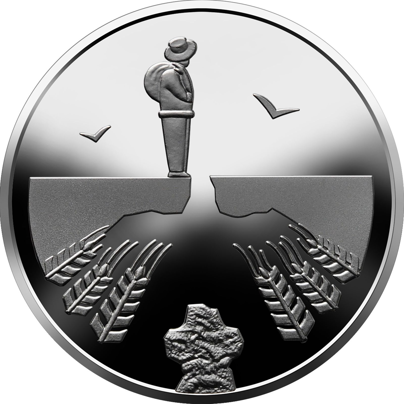 Опис: На гладкому тлі зображена самотня постать людини, яка вирушає в далеку подорож; на передньому плані — кам'яний хрест, праворуч і ліворуч від якого — колоски пшениці; по обидва боки від постаті — стилізовані птахи.