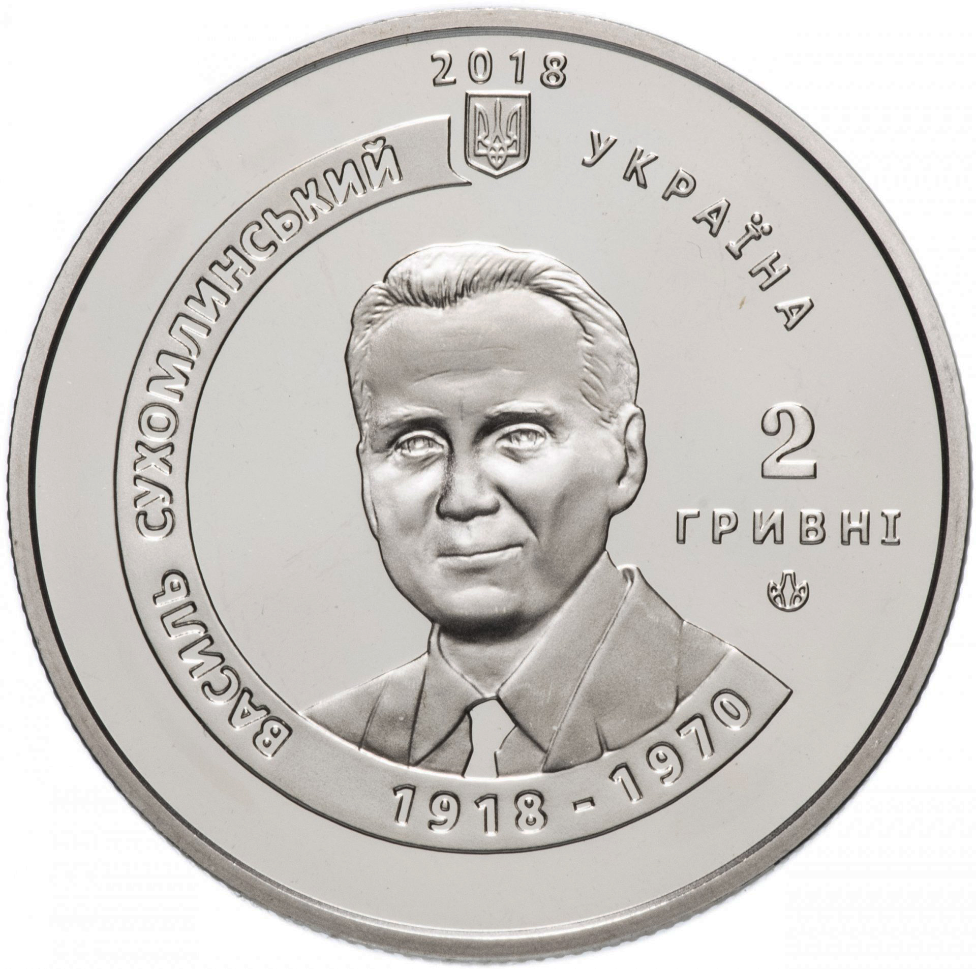 Опис: У верхній частині монети зображено малий герб України; праворуч від герба — напівкругла легенда «УКРАЇНА»; над гербом — рік випуску монети 2018; у центрі — портрет Василя Сухомлинського на гладкому тлі, праворуч від нього — номінал монети 2/ГРИВНІ (2/гривні) та знак монетного двору ПБНБ «Банкнотно-монетний двір»; напівкруглі написи на матовому тлі: ВАСИЛЬ СУХОМЛИНСЬКИЙ ліворуч, 1918 – 1970 під портретом.
