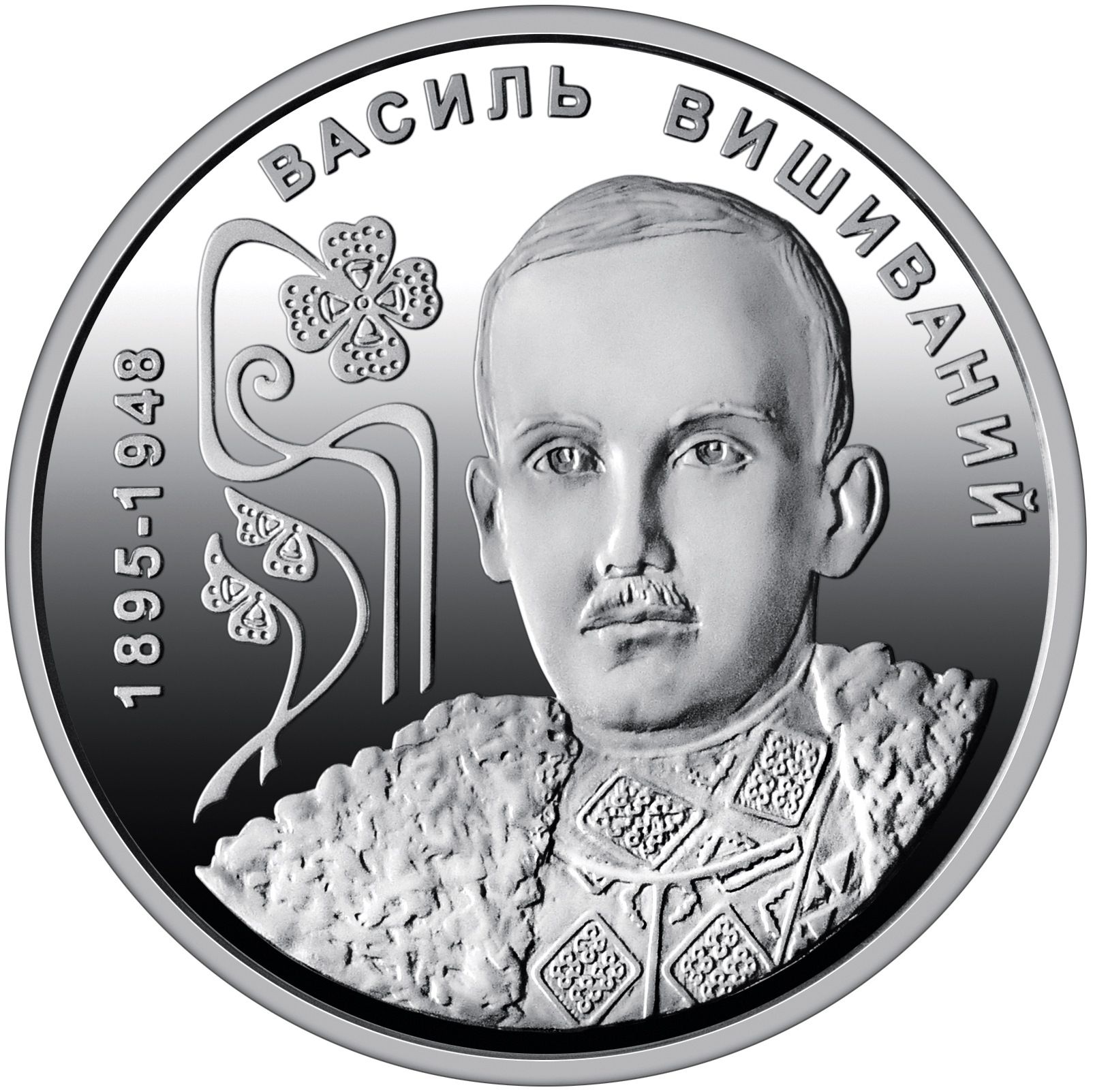 Опис: Портрет Василя Вишиваного, одягненого у вишиванку (традиційну вишиту українську сорочку) та кожух (овечу шубу) — предмети одягу, які стали частиною його особистої ідентичності. Зліва — декоративний орнамент із листям конюшини, який був талісманом військової удачі для українських січових стрільців і прикрашав обкладинку збірки віршів Вишиваного «Минулі дні...», присвяченої борцям за свободу України.