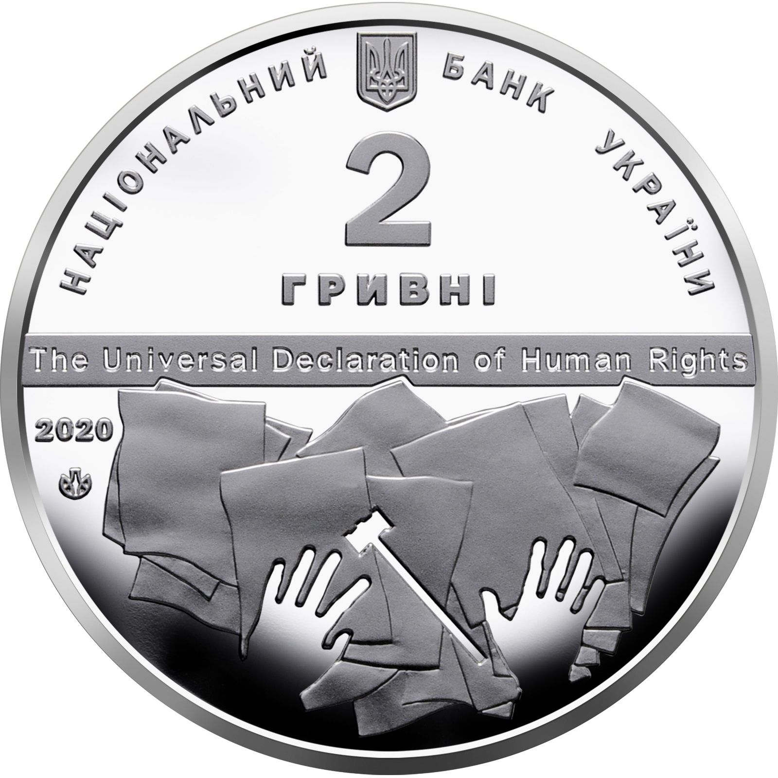 Опис: Зверху зображено малий герб України; ліворуч від герба — напис НАЦІОНАЛЬНИЙ (Національний), праворуч від герба — напис БАНК УКРАЇНИ (Банк України), під гербом — напис 2/ ГРИВНІ (2/гривні); у центрі – напис THE UNIVERSAL DECLARATION OF HUMAN RIGHTS (Загальна декларація прав людини); ліворуч – рік випуску монети – 2020, під яким – знак монетного двору ДЗППБ НБУ; нижче, на тлі аркушів паперу, – зображення рук і молотка, що символізують процес ухвалення судових рішень).