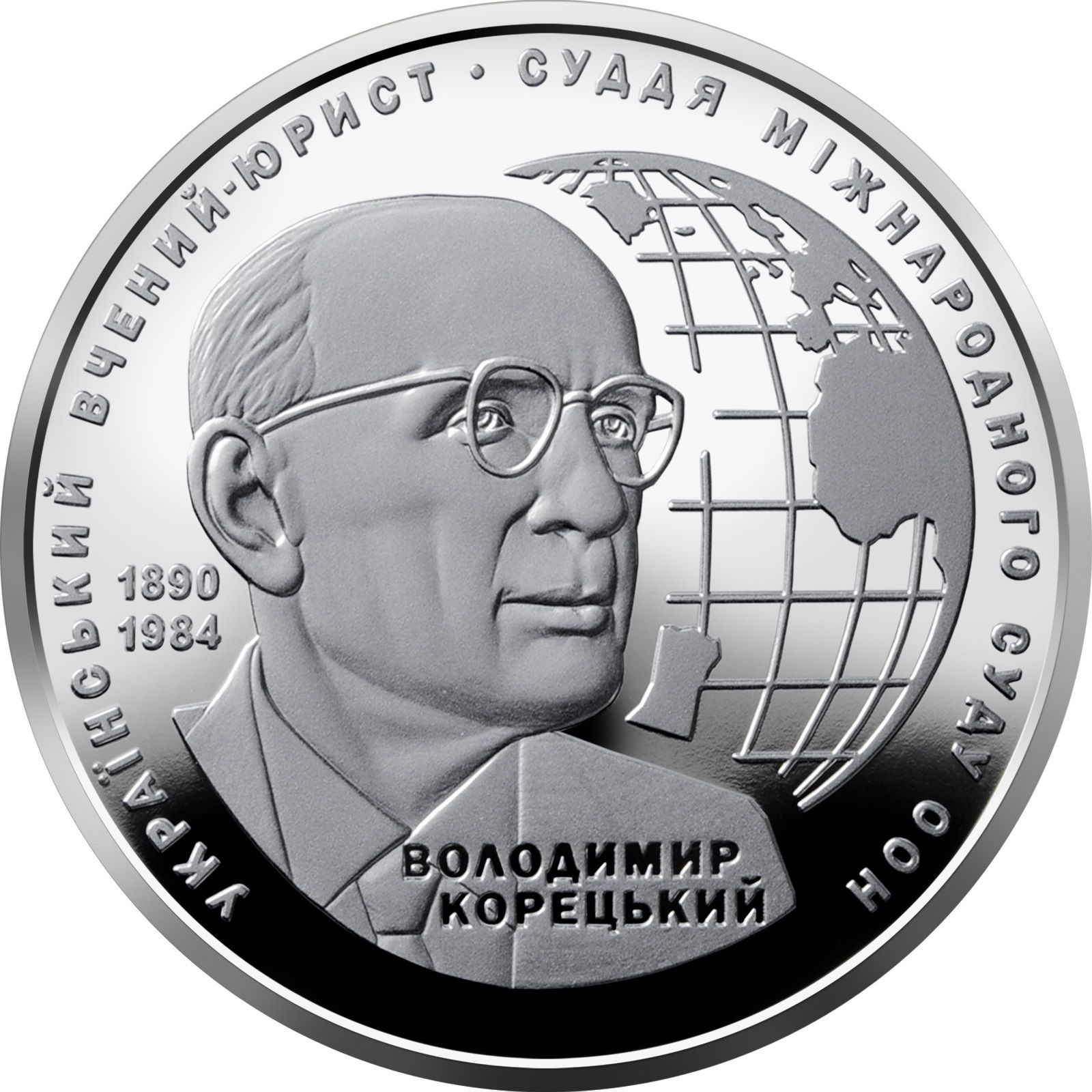 Опис: На тлі глобуса, що символізує міжнародну діяльність Корецького, зображено його портрет та роки його життя.