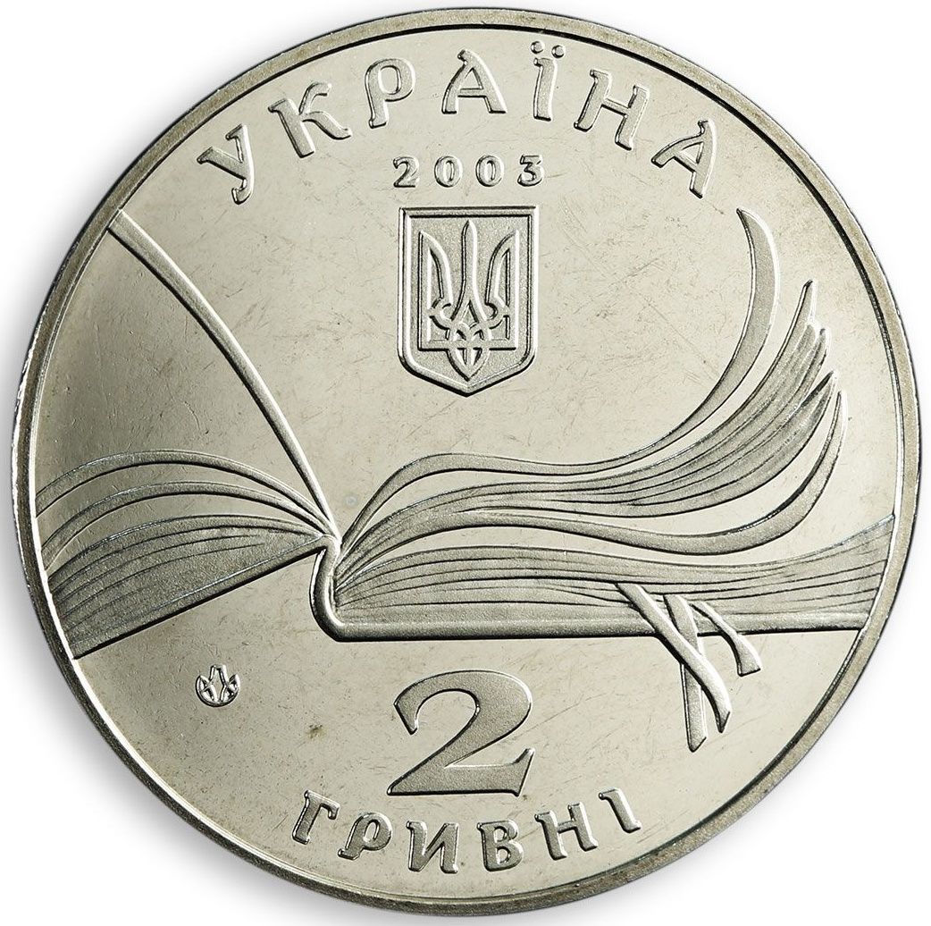 Опис: Зображено відкриту книгу, над якою розміщено невеликий Державний герб України та написи: УКРАЇНА (зверху півколом), 2003, (Україна /2003) 2 ГРИВНІ (2 /гривні) (знизу), а також логотип Монетного двору Національного банку України.