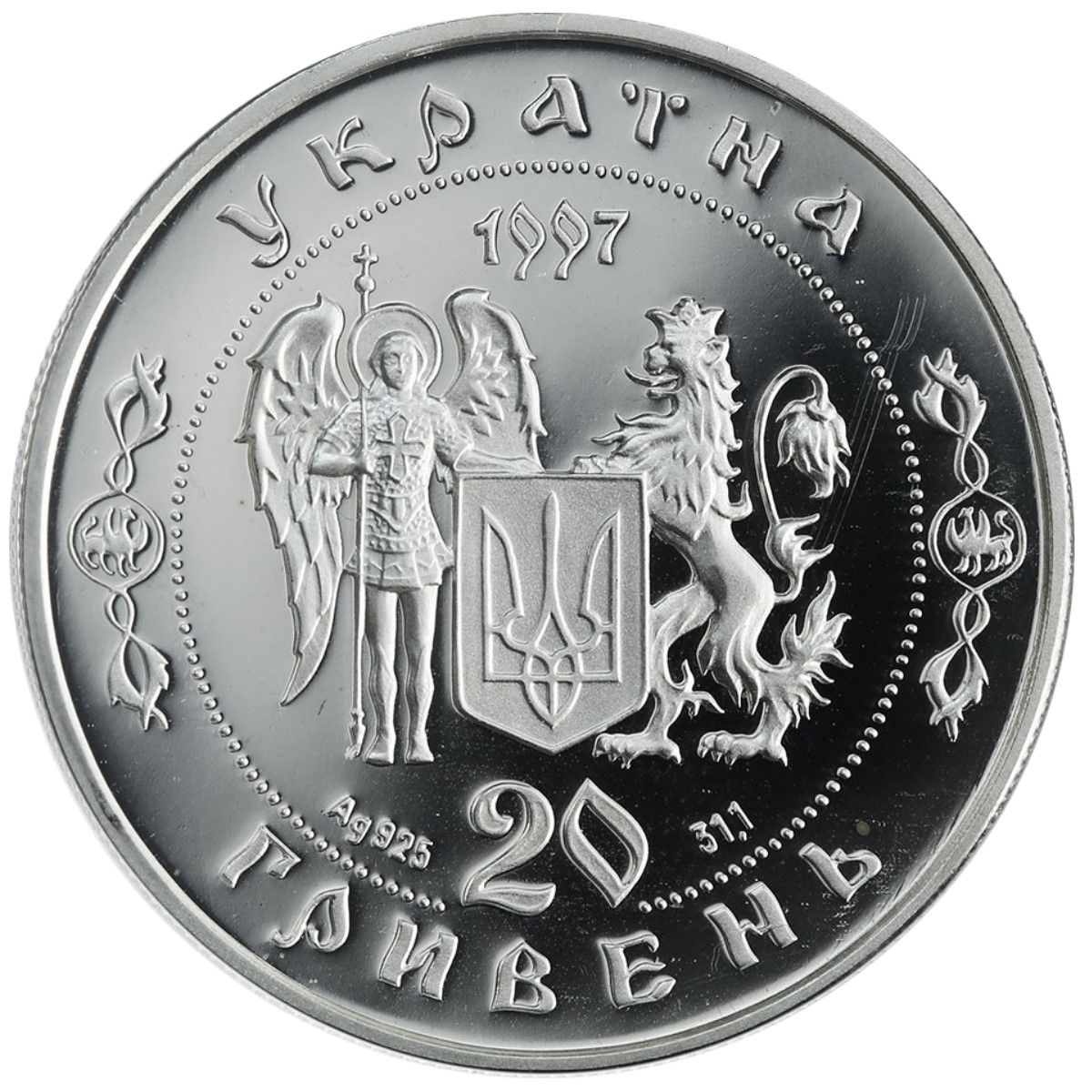 Опис: На монеті зображено типову для цієї серії сцену, яка втілює ідею цілісності України: малий Державний герб України, підтриманий вибитими фігурами Святого Михаїла Архістратега в лицарському обладунку зі списом, покровителя Києва та коронованого лева (символи Великого князівства Галичини та Волині відповідно) та стилізовані написи: УКРАЇНА та 20 ГРИВЕНЬ, номінал монети, розташовані нижче у два рядки. Усі написи відокремлені один від одного бароковими орнаментами та зображеннями грифонів. Ліворуч від цифри 20 розміщені позначення Аg 925 та 31,1, вага монети у пробі.