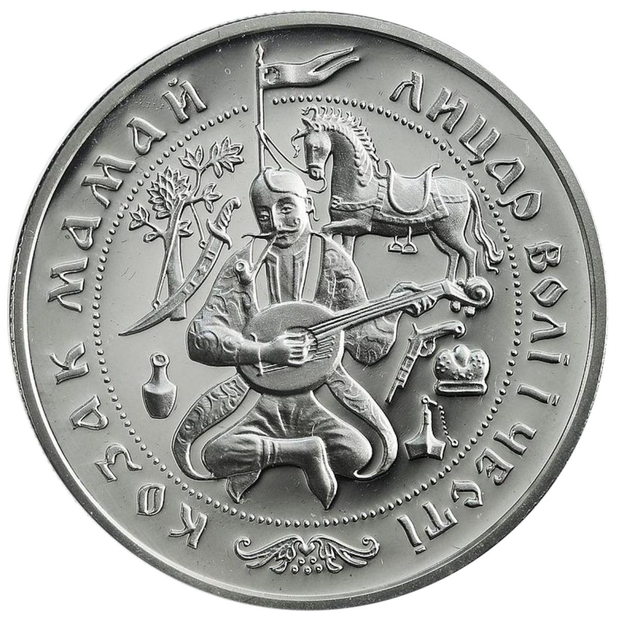 Опис: У колі, зробленому з низки намистин, зображено композицію, популярну в народному мистецтві України XVIII–XX століть: козак Мамай, одягнений у багатий пальто з хутряною облямівкою, сидить по-турецьки, курить люльку та грає на бандурі. Навколо нього зображені традиційні атрибути козацького військового життя того періоду: кінь у гарному обладунку, прив'язаний до спису з маленьким прапорцем на верхівці, встромленого в землю; зелений дуб із підвішеною шаблею; пістолет і кам'яна порохівниця; високий турецький капелюх і пляшка «оковита» (українська горілка). По зовнішньому колу монети розміщені написи: КОЗАК МАМАЙ (Козак Мамай) – ліворуч і ЛИЦАР ВОЛІ І ЧЕСТІ (лицар волі і честі) – праворуч. Над цими написами розміщено невеликий прапорець на кінці спису, а під ними – стилізована гілка журавлини.