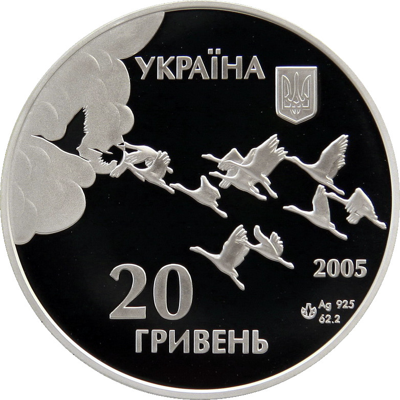 Опис: На монеті зображено журавля, що зникає в хмарах, напис «УКРАЇНА» (вгорі) та невеликий герб України (праворуч). Під клином — 2005, рік випуску монети, нижче — Ag 925, позначення металу та 62,2 г, його вага в пробі, а також логотип Монетного двору Національного банку України; нижче — 20/ ГРИВЕНЬ (20 / гривня), номінал монети.