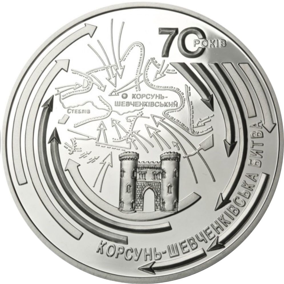 Опис: Має умовну композицію: у центрі, на тлі карти, зображено вхідні ворота палацового ансамблю в місті Корсунь-Шевченківський; по колу монети зображено стріли, що символізують наступ радянських військ по всьому оточенню ворожих угруповань, з написами: праворуч, зверху — «70 років» і, у вигляді лука, знизу — «КОРСУНЬ-ШЕВЧЕНКІВСЬКА БИТВА».