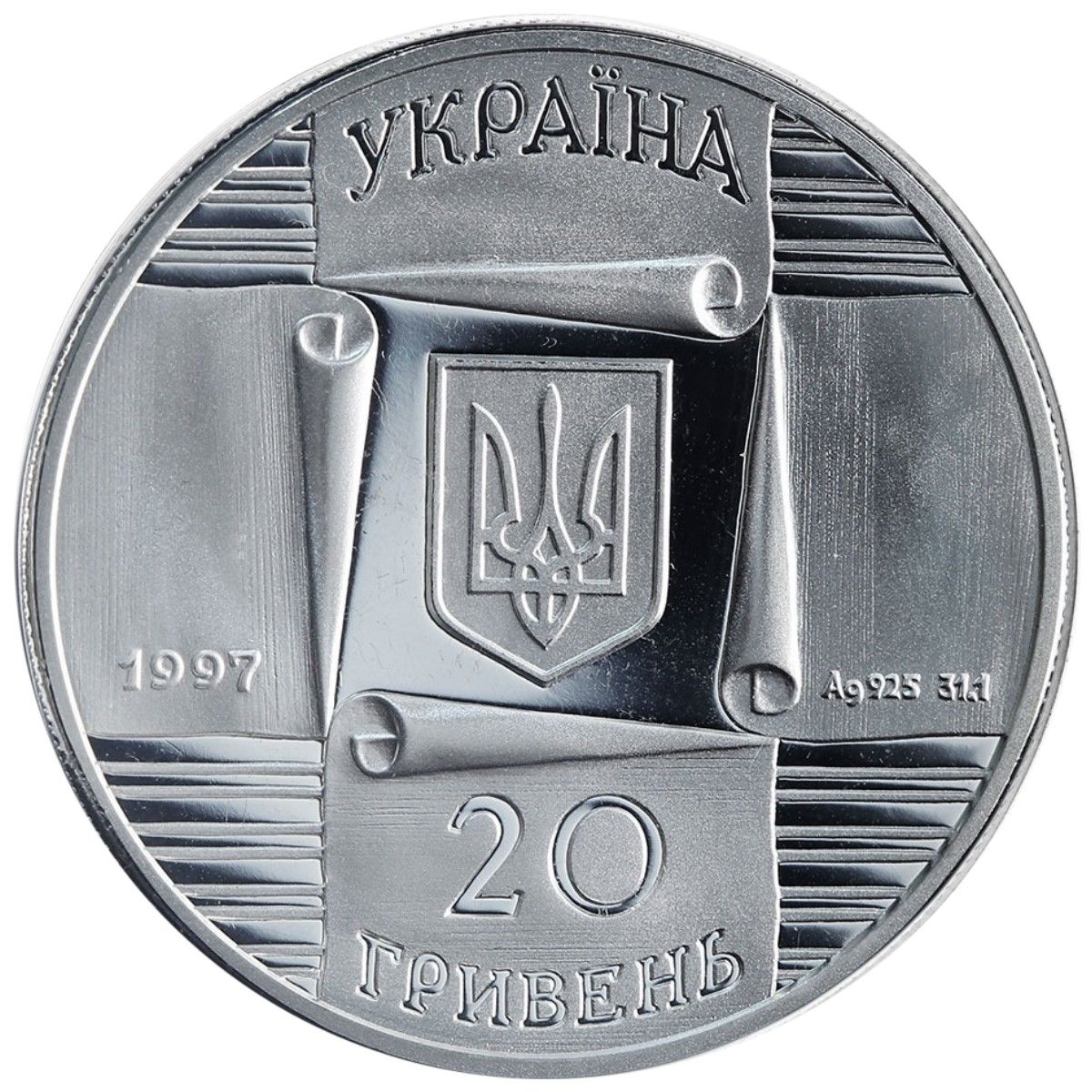 Опис: У центрі композиції зображено малий герб України, виконаний у вигляді чотирьох перехрещених рулонів паперу на тлі горизонтальних ліній. На рулонах є написи: «УКРАЇНА» зверху та «20 ГРИВЕНЬ» знизу у два рядки; «1997», рік випуску монети, — ліворуч, а позначення Ag 925 та 31,1, чиста вага монети, — праворуч.