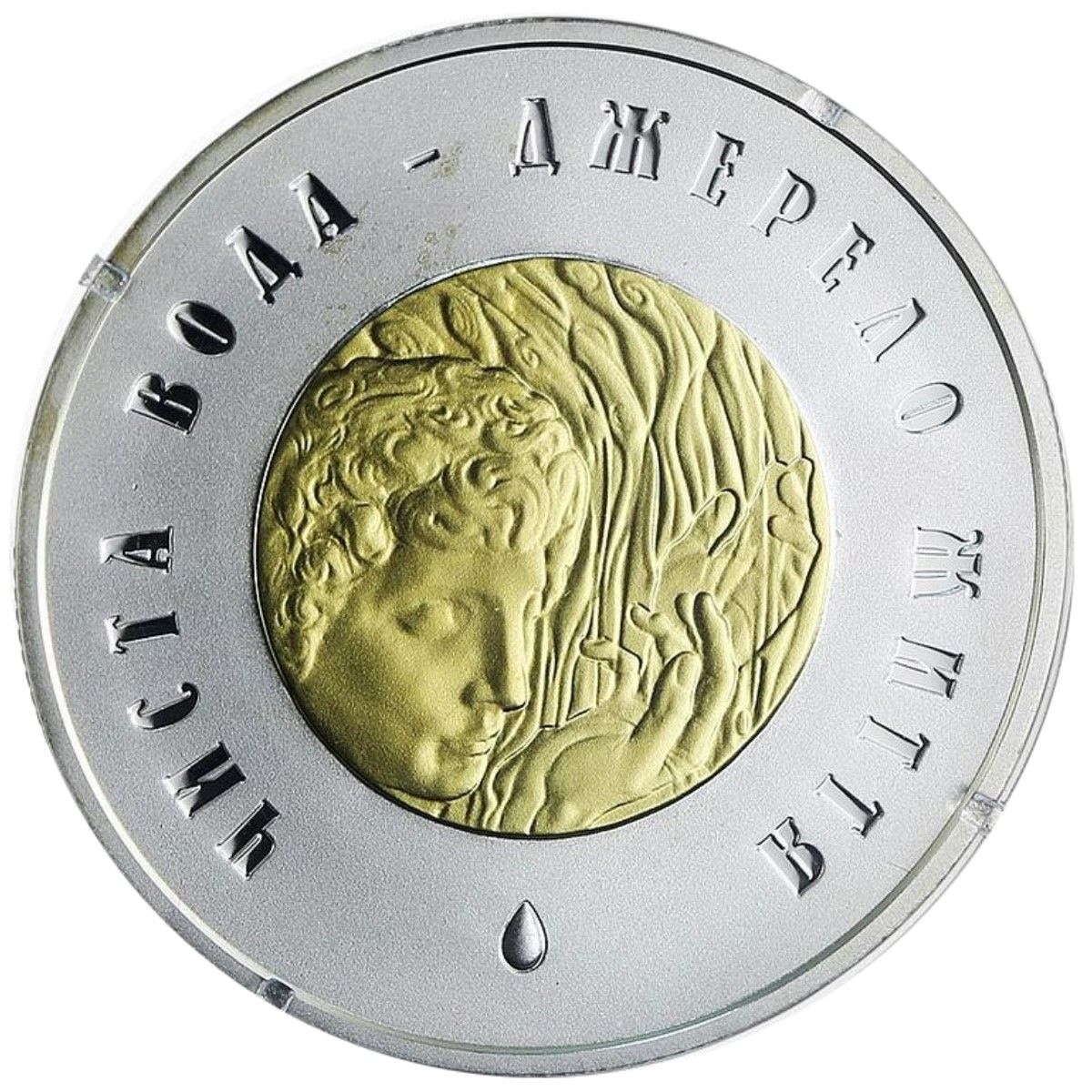 Опис: У внутрішньому колі зображено хвилі, що розходяться від краплі на поверхні води, а над ним — ще одна крапля. У зовнішньому колі ліворуч зображено малий герб України, праворуч – рік випуску монети: 2007, по колу зверху – напис: НАЦІОНАЛЬНИЙ БАНК УКРАЇНИ, зверху – номінал: 20 ГРИВЕНЬ, а також логотип Монетного двору Національного банку України.