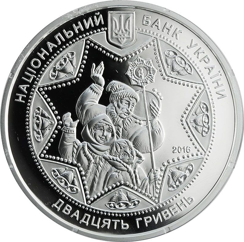 Опис: Зверху розміщений малий герб України з напівкруглим написом — НАЦІОНАЛЬНИЙ БАНК УКРАЇНИ (Національний банк України), знизу — номінал ДВАДЦЯТЬ ГРИВЕНЬ (двадцять гривень); всередині круга з бусинками зображено різдвяну зірку з колядниками в центрі; ліворуч від колядників на гладкій поверхні розміщено рік випуску - 2016; між кожною парою променів зірки зображено три дзвіночки.