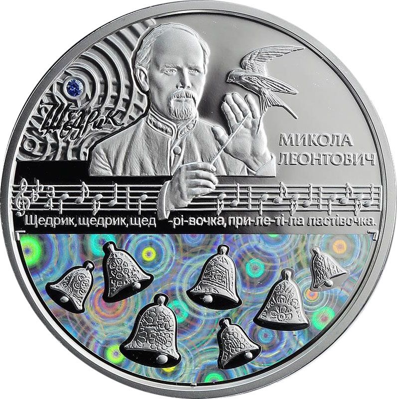 Опис: Композиція розділена на дві частини з умовною музичною серією з «Щедрика»: зверху — портрет Миколи Леонтовича з диригентською паличкою в правій руці, на лівій руці композитора сидить ластівка, праворуч — напис МИКОЛА/ЛЕОНТОВИЧ; ліворуч від портрета на тлі концентричних кілець, що символізують звуки музики, з вставкою з кубічного оксиду цирконію, розміщено напис ЩЕДРИК; нижче — «колядка дзвонів»: дзвони на тлі кольорових голографічних кілець.