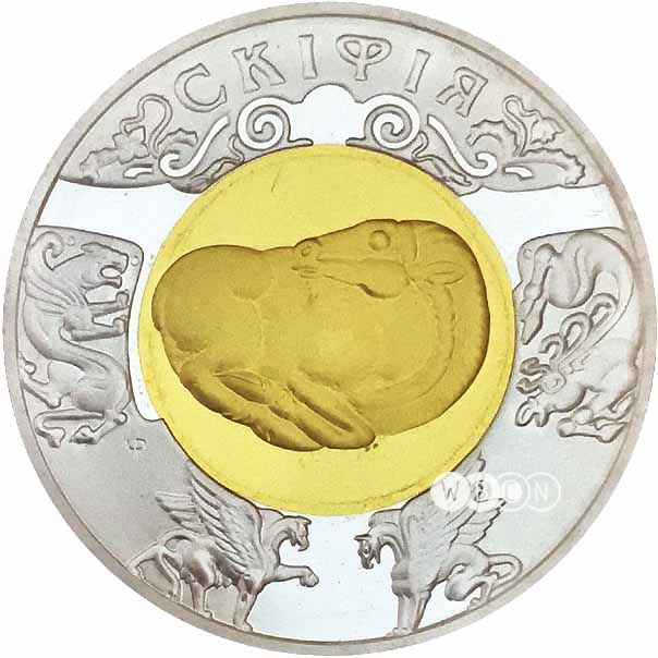 Опис: Символічне колесо історії, на якому сидить сокіл, під ним зображено змію в центрі монети; скіфський воїн з чашею в руці ліворуч і скіфська королева, що тримає дзеркало, праворуч, а також державний герб, номінал, назва країни та рік випуску зображені на кільці.