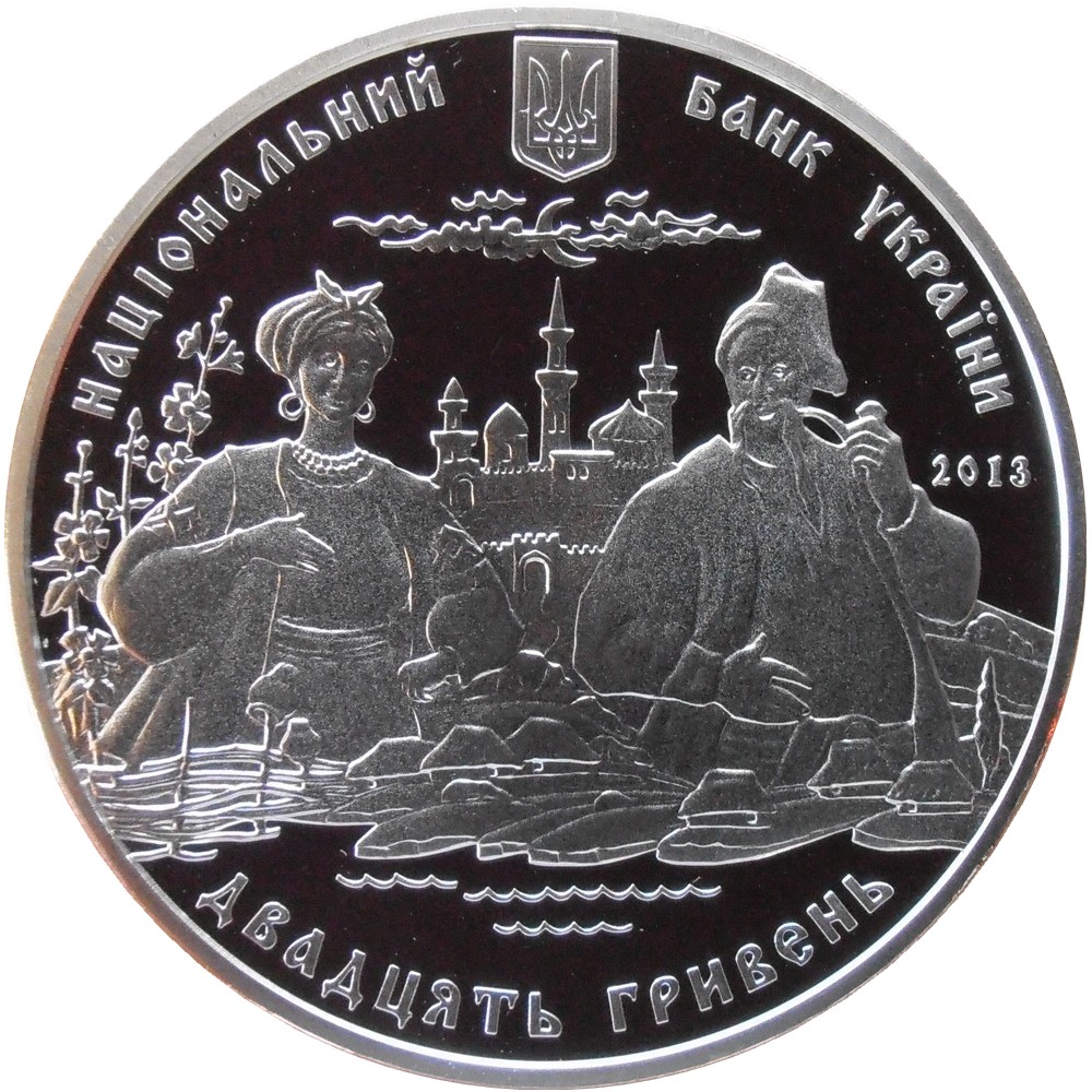 Опис: Зверху розміщений малий герб України з напівкруглою легендою НАЦІОНАЛЬНИЙ БАНК УКРАЇНИ (Національний банк України); у центрі — стилізована композиція із зображенням Одарки та Івана Караса, головних героїв опери, на тлі зображення мечеті; на передньому плані — сільський пейзаж — хати з солом'яними дахами, паркан, мальви; написи — 2013 праворуч, ДВАДЦЯТЬ ГРИВЕНЬ (двадцять гривень) півколом знизу.