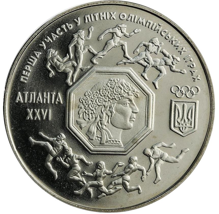 Опис: У центрі зображено восьмигранник, на якому зображено профіль молодої жінки з квітковим вінком — символічний образ України, взятий з банкноти Григорія Нарбута 1918 року. Зверху зображені фігури п'яти античних атлетів, знизу — фігури п'яти сучасних спортсменів. Праворуч від октаедра — емблема Національного олімпійського комітету України, ліворуч — дворядковий напис АТЛАНТА XXVI.