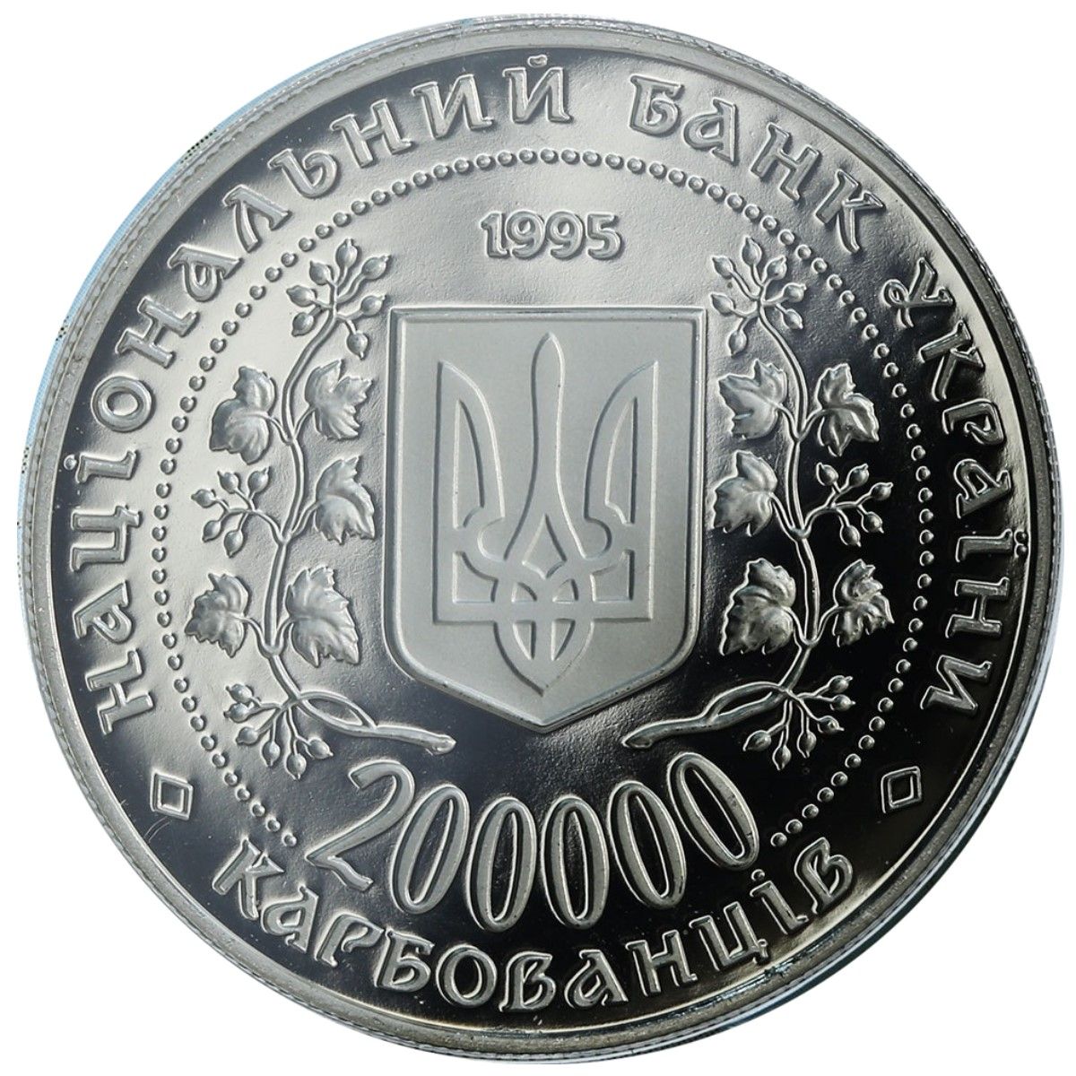 Опис: У центрі орнаменту з бусин, обрамленого гілками калини, зображено малий герб України. На кожній гілці п'ять листків і три грона ягід. Верхнє гроно складається з семи ягід, середнє — з п'яти, нижнє — з шести ягід. Над гербом розміщено рік випуску — 1995. Під малим гербом розміщено дворядковий напис «200000 КАРБОВАНЦІВ», номінал монети (цифра 200000 розділена орнаментом у вигляді намистин). По колу монети, між зовнішнім краєм і орнаментом з бусин, розміщений напис НАЦІОНАЛЬНИЙ БАНК УКРАЇНИ, розділений ромбоподібними розділовими знаками від слова КАРБОВАНЦІВ.