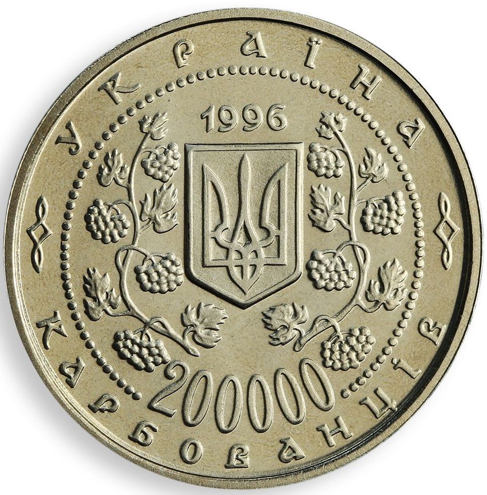 Опис: Посередині орнаменту з намистин, обрамленого гілками калини, розміщено малий Державний герб України. Над Державним гербом вказано рік випуску — 1996. По колу монети розміщено написи: УКРАЇНА — зверху та дворядковий напис 200000 КАРБОВАНЦІВ.