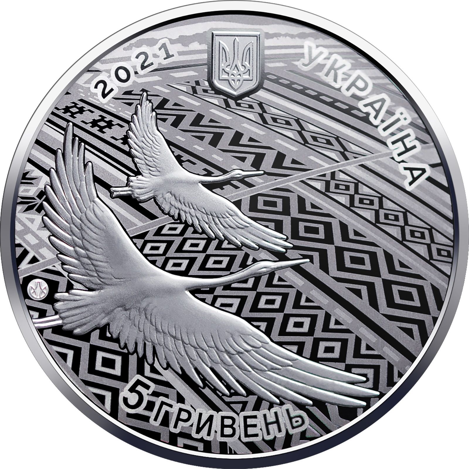 Опис: Композиція, що символізує Україну – малий герб України зверху та на тлі розлогих мальовничих полів, зображених у вигляді стилізованих орнаментів із лелеками, які є одним із символів України; написи: УКРАЇНА (напівкругла легенда праворуч), 2021 (ліворуч від герба), номінал монети 5 ГРИВЕНЬ (напівкругла легенда знизу); знак монетного двору ПБНБУ (праворуч).
