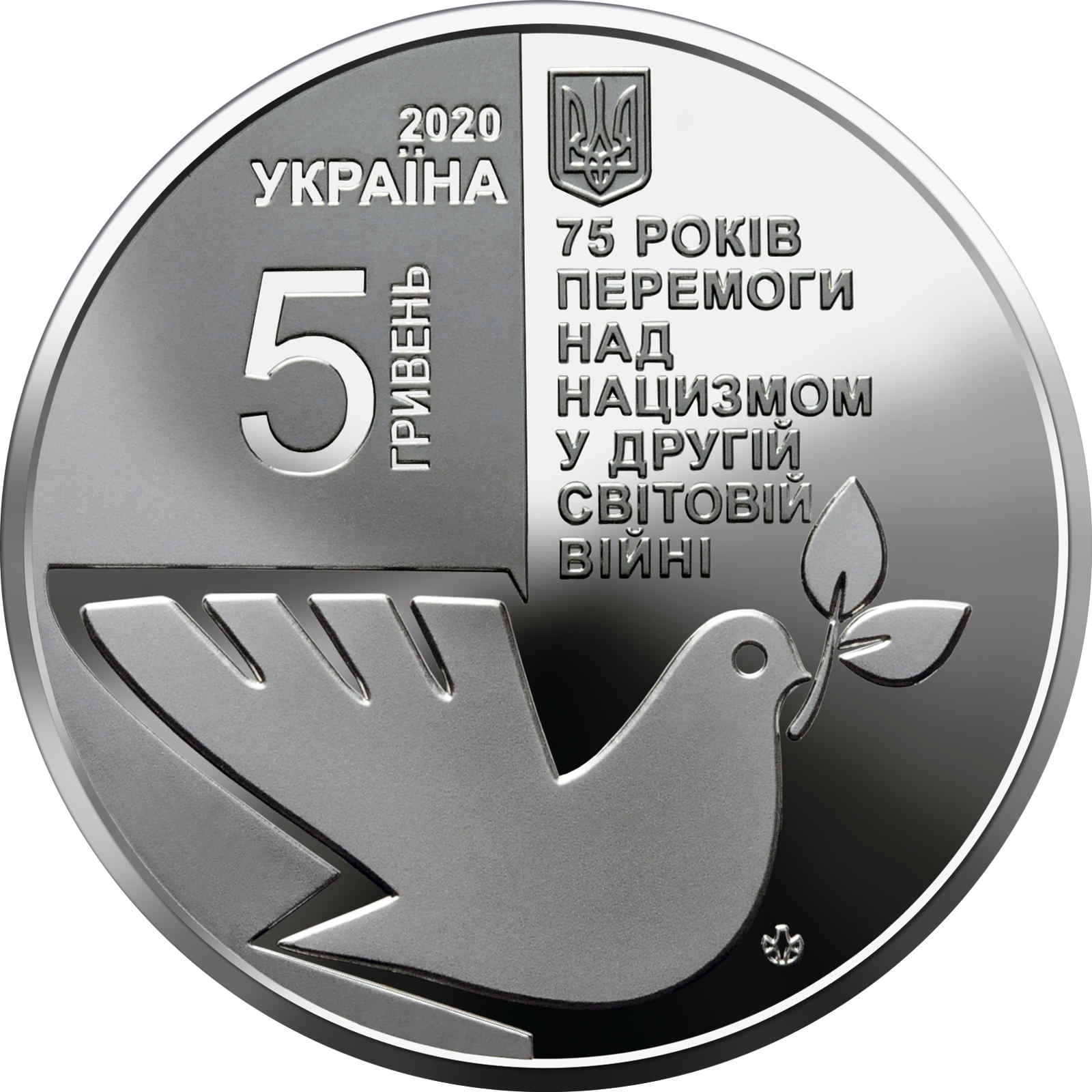 Опис: У верхній частині на гладкому тлі зображено малий герб України, під яким розміщено напис 75 РОКІВ/ ПЕРЕМОГИ/ НАД/НАЦИЗМОМ/ У ДРУГІЙ/ СВІТОВІЙ/ ВІЙНІ (75-та річниця перемоги над нацизмом у Другій світовій війні); ліворуч на матовому тлі розміщені написи: 2020/ УКРАЇНА/ 5 ГРИВЕНЬ (2020/Україна/5 гривень) (напис ГРИВЕНЬ розташований вертикально); нижче, на гладкому тлі, зображено голуба, що тримає в дзьобі оливкову гілку як символ свободи, миру та перемоги. Нижче, праворуч, розміщено знак монетного двору НБУ «Банкнотно-монетний двір НБУ».