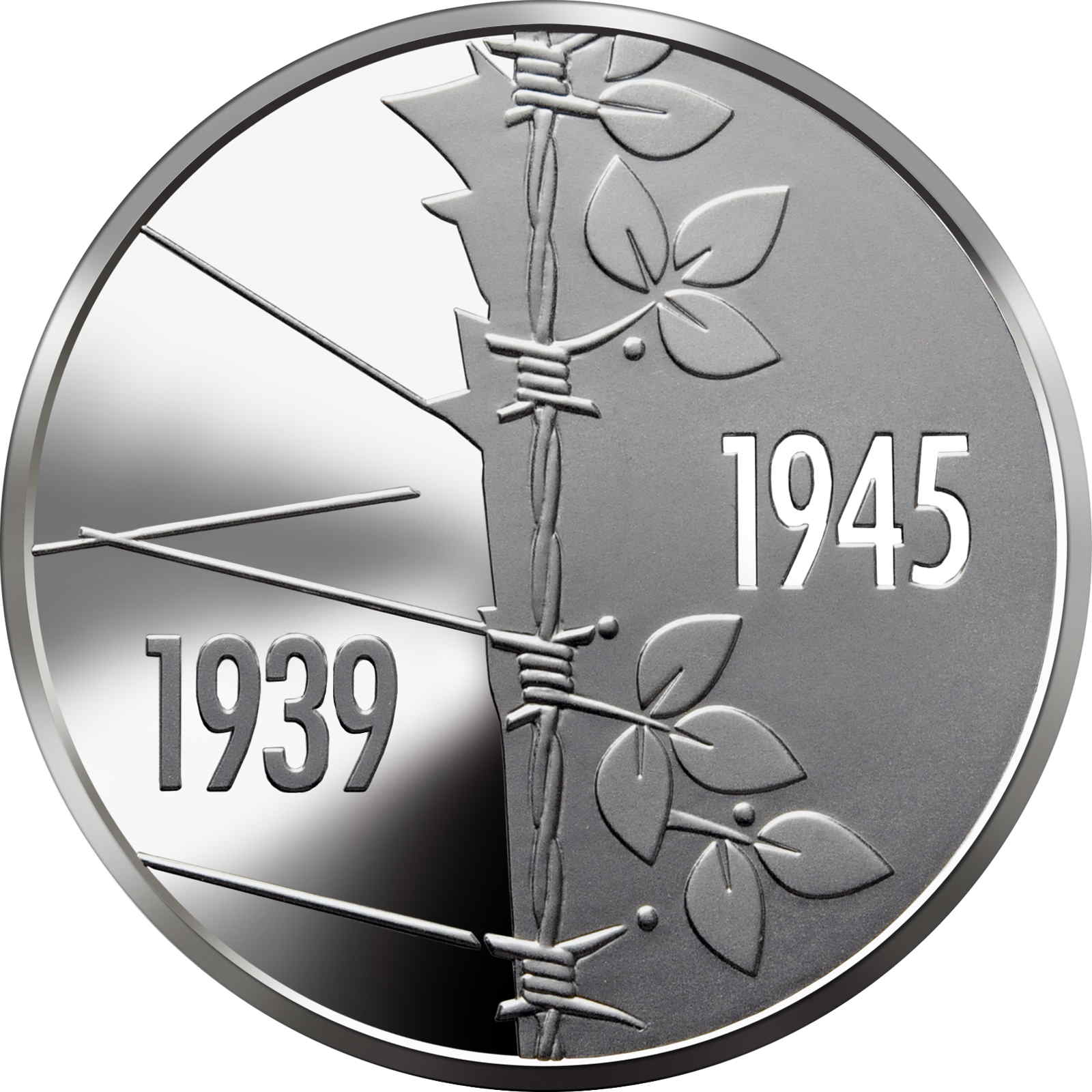 Опис: Існує така умовна композиція: вертикальний колючий дріт як умовна лінія між військовою (лівою) частиною з тріщинами та розірваними краями, що символізує напругу, тривогу та біль, на тлі якої розміщено напис — 1939, та мирною частиною, де з колючого дроту проростають листя, що символізують відродження та продовження життя, на тлі якої розміщено напис — 1945.