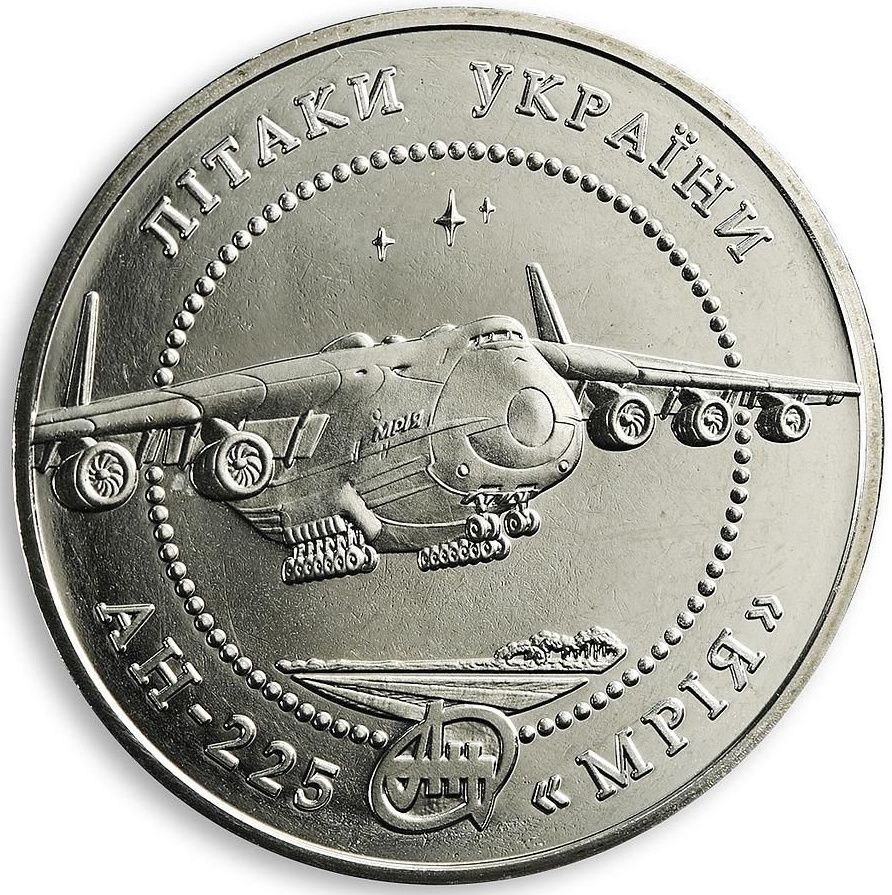 Опис: На монеті зображено надважкий літак над злітною смугою, оточений написами: ЛІТАКИ УКРАЇНИ (літаки України) (зверху) та АН-225 «МРІЯ» (АН-225 «Мрія») (знизу); логотип АН (AN) розташований між останнім написом.