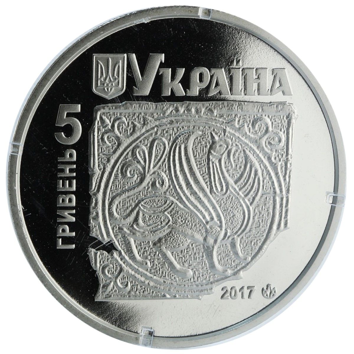 Опис: У верхній частині монети зображено малий герб України та напис «УКРАЇНА»; у центрі на гладкому тлі — фрагмент керамічної тарілки з зображенням грифона (XII століття), ліворуч від якого розташований вертикальний напис «5 ГРИВЕНЬ»; праворуч внизу — рік випуску «2017» та знак монетного двору НБУ.