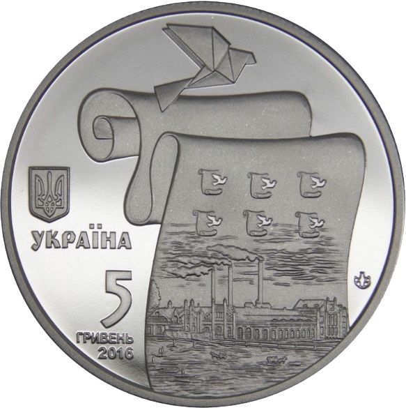 Опис: Є рулон паперу для банкнот із зображенням Малинської паперової фабрики, заснованої в другій половині 19 століття; над ним — стилізоване зображення паперового птаха; ліворуч від рулону — малий державний герб України, напис «УКРАЇНА», номінал монети «5/ГРИВЕНЬ», рік випуску монети «2016» та знак монетного двору ДП «Банкнотно-монетний двір НБУ».