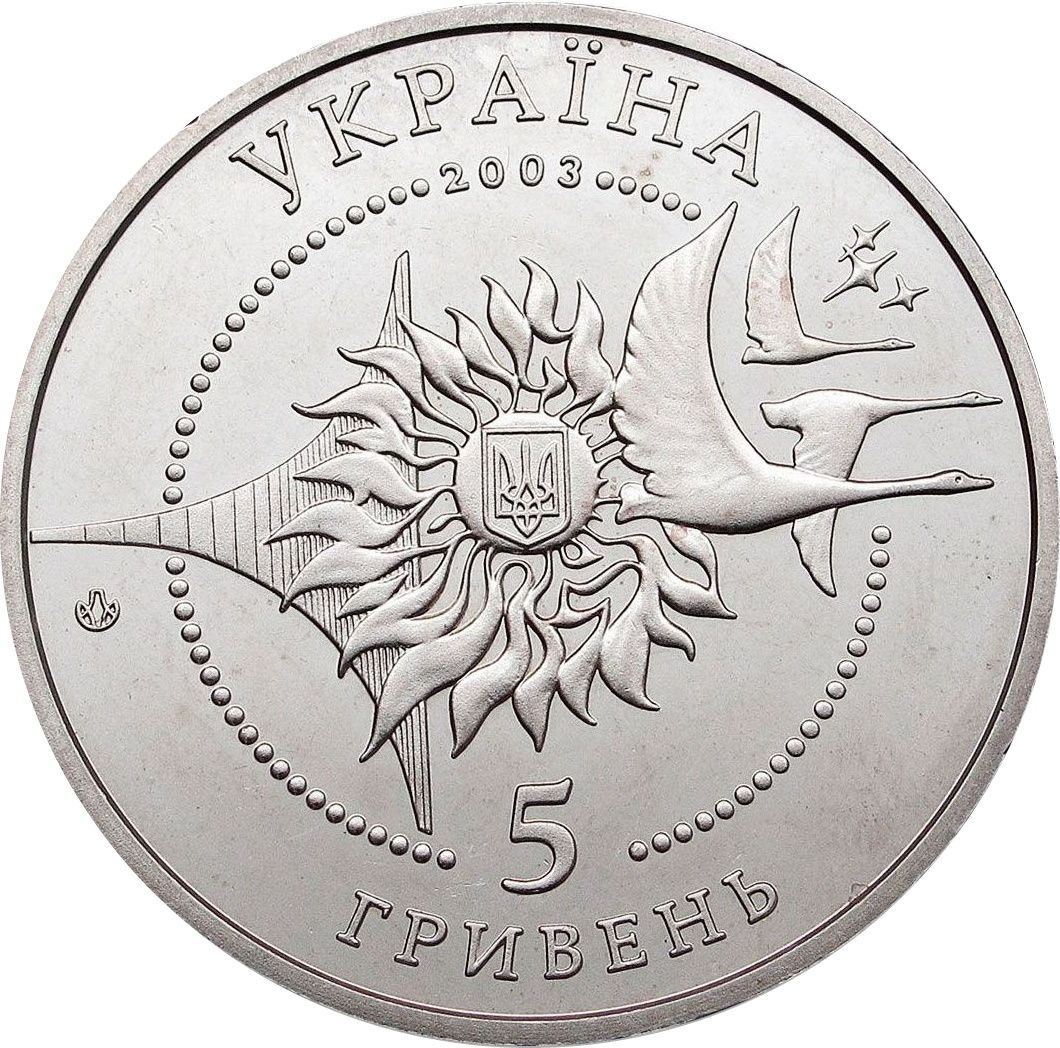 Опис: У центрі кола, утвореного ниткою з намистин, зображено малий Державний герб України в алегоричній композиції з сонця, стилізованого крила, птахів і зірок, що символізують мрію людства досягти космічного простору. Є такі написи: УКРАЇНА, 2003, 5, ГРИВЕНЬ (Україна/ 5/ гривня/ 2003).