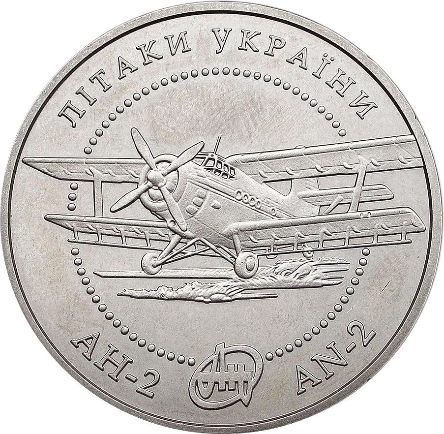 Опис: На монеті зображено літак АН-2 та кругові написи: зверху — ЛІТАКИ УКРАЇНИ (літаки України); знизу — АН-2 та АН-2, між якими зображено логотип АН.