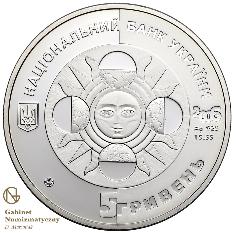 Опис: У центрі кола зображено стилізоване сонце, ліворуч і праворуч від нього, а також над і під ним — чотири сонячні сфери, що символізують чотири пори року. Ліворуч від кола зображено малий герб України, праворуч — 2006, рік випуску монети, Ag 925, позначення металу та 15,55 г, її вага; по колу монети розміщено написи: НАЦІОНАЛЬНИЙ БАНК УКРАЇНИ (Національний банк України) (зверху), 5 ГРИВЕНЬ (5 гривень) (знизу), а також логотип Монетного двору Національного банку України.