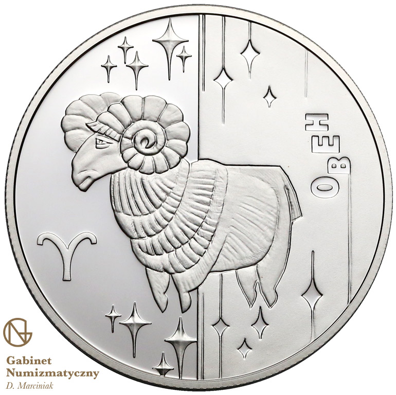 Опис: Зображено стилізоване зображення Овна з зірками навколо нього, ліворуч від якого знаходиться його знак зодіаку; праворуч є напис: ОВЕН (Aries).