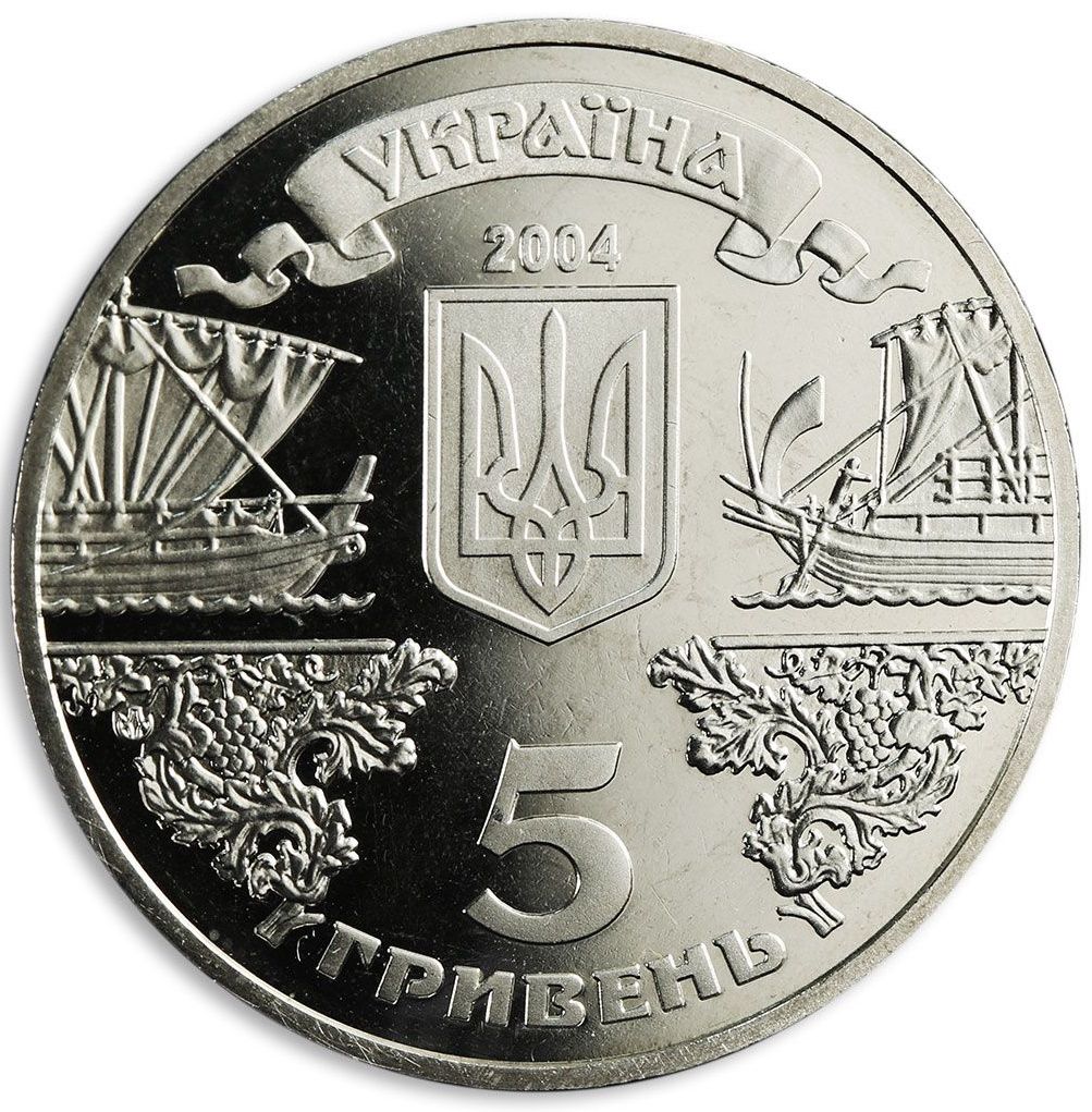 Опис: На монеті зображені давньогрецькі торгові кораблі, між ними в центрі — невеликий Державний герб України, під яким розміщено дворядковий напис: 5 ГРИВЕНЬ (5 гривень) у рамці орнаментальної композиції з листя аканта та виноградної лози; поруч — логотип Монетного двору Національного банку України. Зверху розміщено напис «УКРАЇНА», під яким – «2004», рік випуску монети.