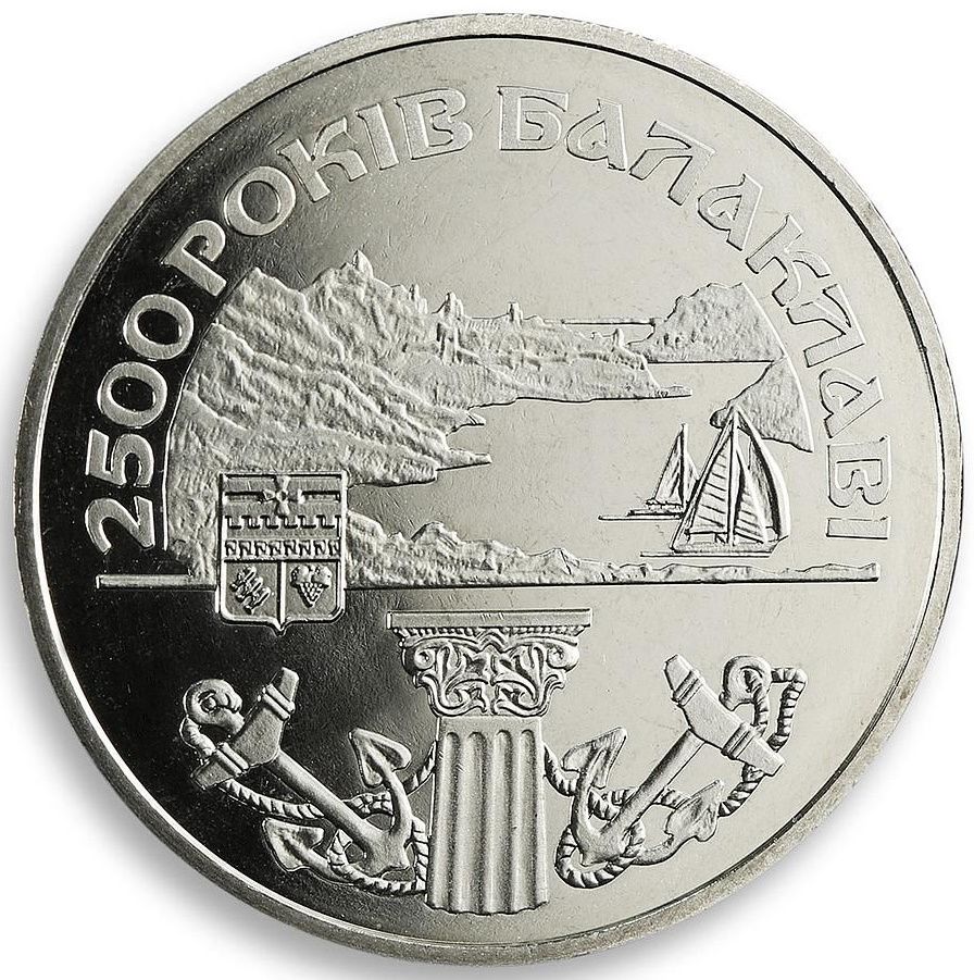 Опис: У верхній частині монети зображено Балаклавську бухту; праворуч — вітрильні кораблі, ліворуч — герб міста Балаклави; у нижній частині монети — колона та два якорі, знайдені під час археологічних розкопок; зверху — напівкруглий напис: 2500 РОКІВ БАЛАКЛАВІ (2500 років Балаклаві)