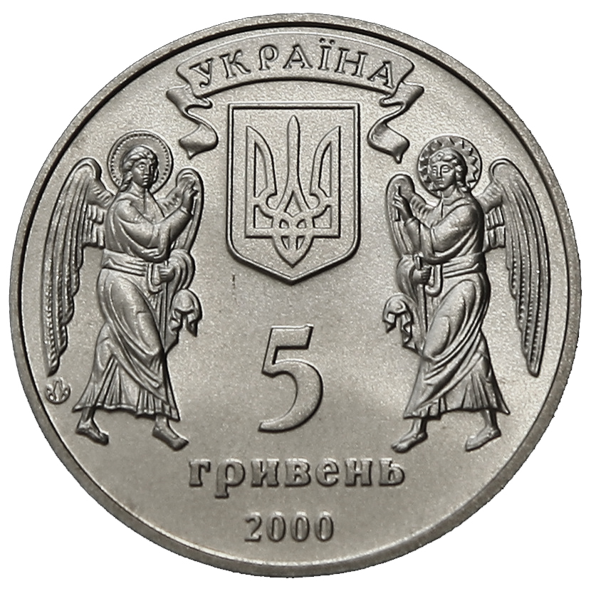 Опис: Між двома фігурами ангелів зображено малий Державний герб України та наступний напис: на німецькій срібній монеті — УКРАЇНА та 5 / ГРИВЕНЬ / 2000, а також розміщено логотип Монетного двору НБУ.