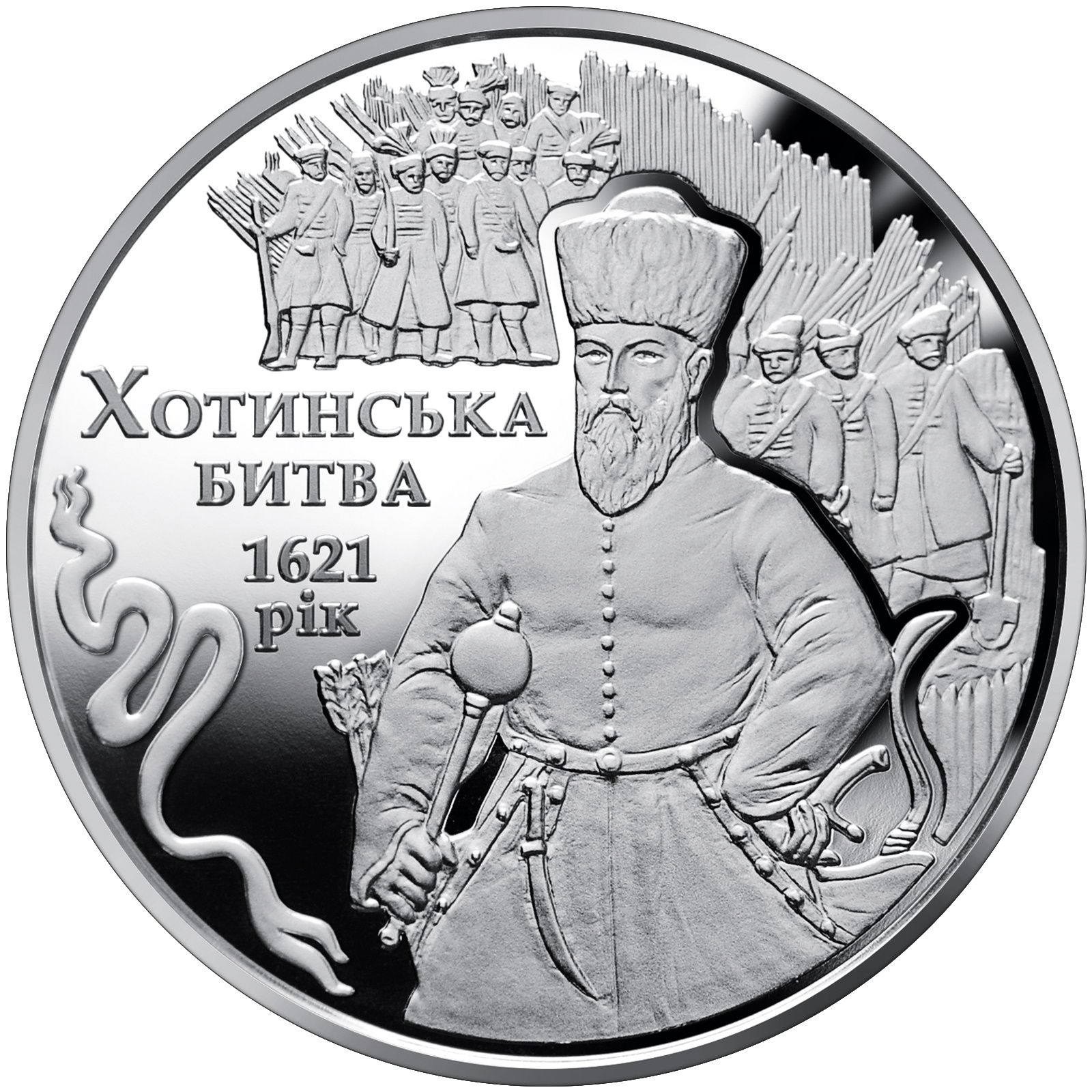 Опис: Вгорі, на гладкому тлі, зображено малий герб України, праворуч від якого — напис «УКРАЇНА»; у центрі — композиція, що символізує облогу військового табору під Хотином: фортеця (ліворуч), армія, що обороняється (праворуч від фортеці), оточена клубами диму; вище, за річкою, праворуч від фортеці, — стилізований табір армії, що штурмує; на монеті розміщені написи: 5/ГРИВЕНЬ (5/гривень) (на тлі фортеці), рік випуску монети – 2021 (знизу, на матовому тлі), під роком випуску – знак монетного двору ДВПБ НБУ.