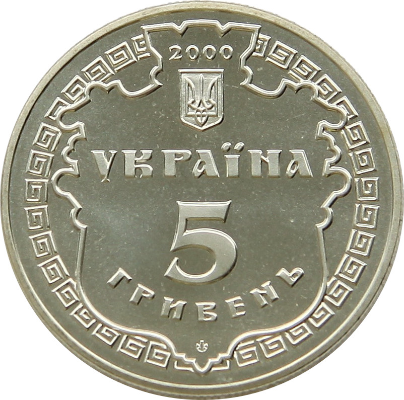 Опис: У рамках старогрецького орнаменту та геральдичного картуша розміщено малий державний герб України та стилізовані написи: 2000, УКРАЇНА, 5, ГРИВЕНЬ, а також перше логотипне зображення Монетного двору Національного банку України.