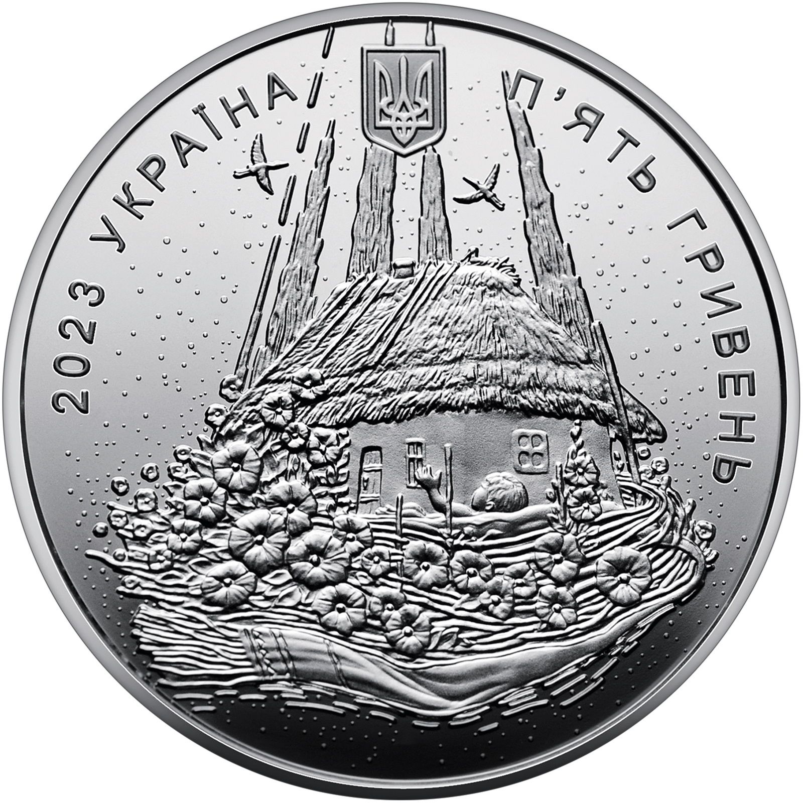 Опис: У верхній частині — невеликий державний герб України, ліворуч і праворуч від якого напівкругом розміщені написи — УКРАЇНА, рік карбування монети — 2023; номінал П’ЯТЬ ГРИВЕНЬ, у центрі зображено картину Олега Шупляка «Колиска», наповнену народним колоритом, яка втілює один із найдорожчих архетипів українців — рідний дім, оточений мальвами та рушником, який є одночасно колискою і гніздом, що символізує продовження роду.