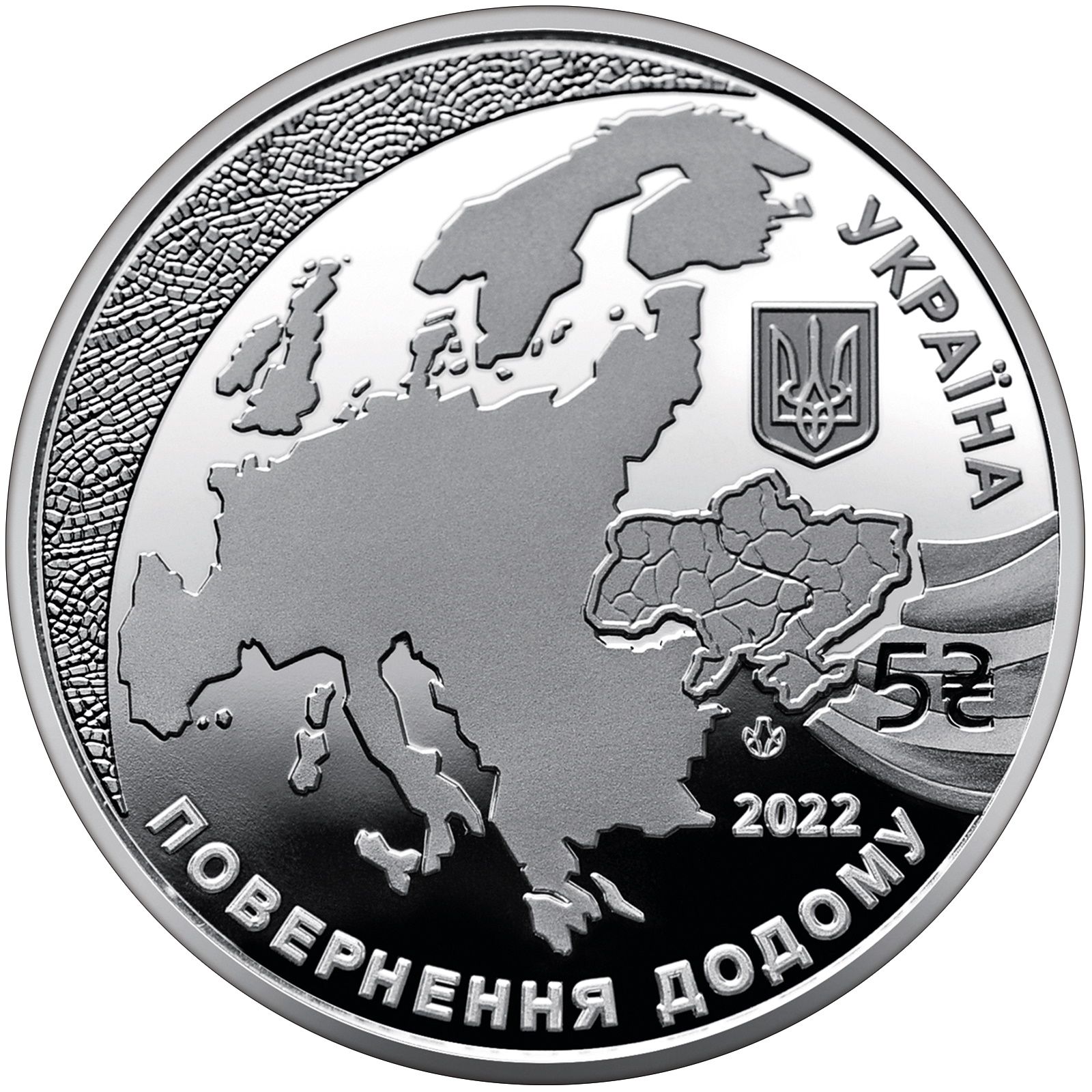 Опис: На дзеркальному тлі зображено стилізоване зображення європейського континенту, ліворуч від якого розташований декоративний елемент у вигляді мозаїчного декору, що символізує різноманітність народів, культур, свободу вибору власної долі, відсутність формальних кордонів; на європейському континенті виділені контури України, які, як пазл, доповнюють цілісність Європи і «повертаються» додому, де вони завжди були опосередковано присутні, починаючи з династичних зв'язків Київської держави; праворуч: малий Державний герб України та напис УКРАЇНА (у півколі); номінал 5 та графічний символ гривні; рік карбування монети 2022 та напис - ПОВЕРНЕННЯ ДОДОМУ (внизу); логотип Монетного двору Національного банку України (під картою України).