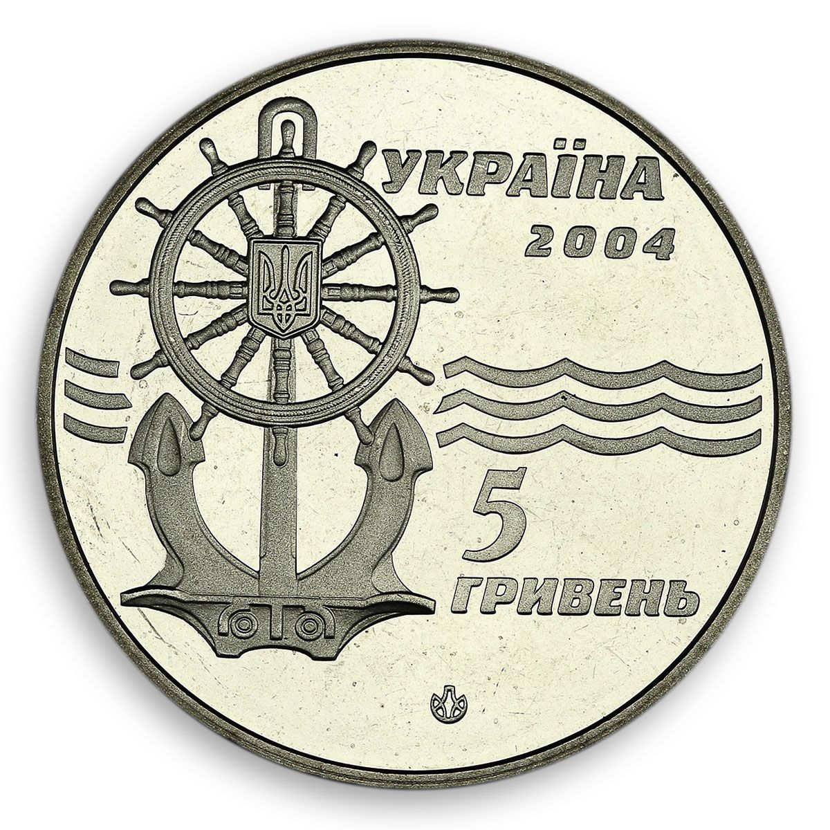 Опис: Зліва зображено якір і штурвал, на тлі яких зображено невеликий Державний герб України; посередині вигравірувані горизонтальні символічні хвилі, над якими розміщені написи: УКРАЇНА/2004 (зверху), 5/ГРИВЕНЬ (знизу). Також є логотип Монетного двору Національного банку України.