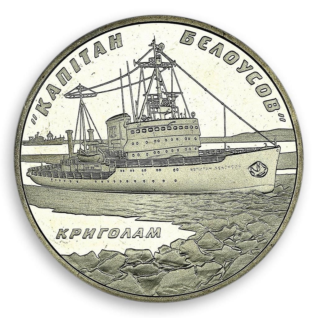 Опис: На монеті зображено криголам серед крижаних брил — на передньому плані, та човен у чистій воді — на задньому плані; є написи: «КАПІТАН БЄЛОУСОВ» («Капітан Белоусов») зверху півколом, а знизу — КРИГОЛАМ (Криголам) горизонтальне зображення на дзеркальному тлі.