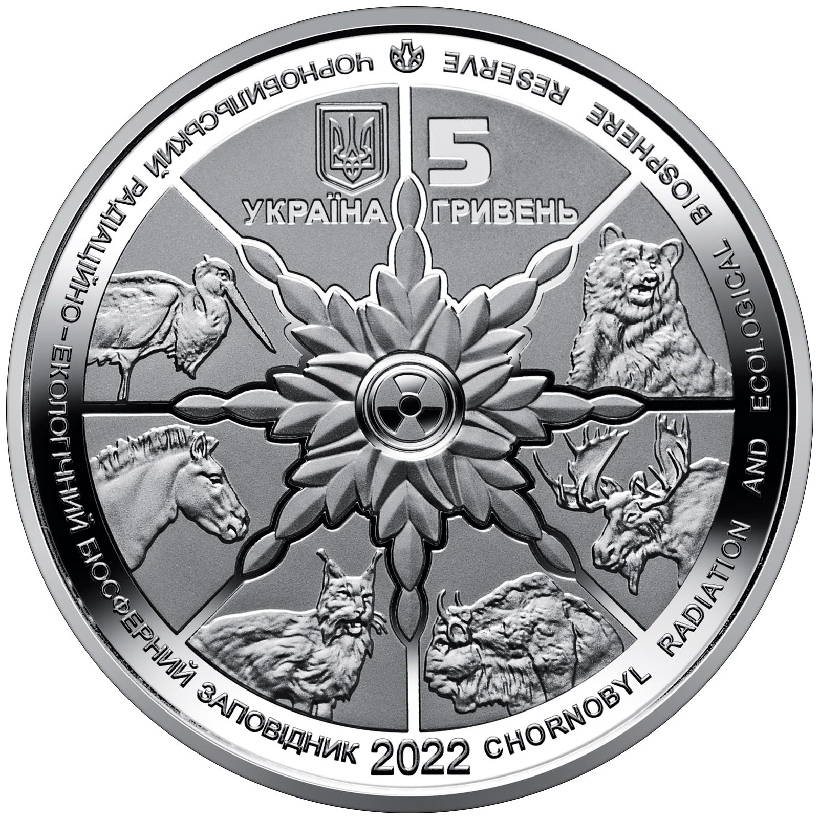 Опис: На аверсі монети зображено: малий Державний герб України (вгорі), написи: УКРАЇНА (Україна) (під гербом); номінал монети — 5 ГРИВЕНЬ (5/гривень) (праворуч від герба); у центрі — символічне колесо життя, що символізує відродження природи: стилізований міжнародний знак «Радіаційна небезпека», оповитий листям, навколо якого зображені тварини, популяції яких розвиваються в 30-кілометровій зоні відчуження, що стала своєрідним племінним заповідником, зокрема чорні лелеки, коні Пржевальського, рисі, зубри, лосі, бурі ведмеді; у колі, на дзеркальному тлі, написи: ЧОРНОБИЛЬСЬКИЙ РАДІАЦІЙНО-ЕКОЛОГІЧНИЙ БІОСФЕРНИЙ ЗАПОВІДНИК (зліва) CHORNOBYL RADIATION AND ECOLOGICAL BIOSPHERE RESERVE; рік випуску монети 2022 (внизу); та знак монетного двору ДП «Банкнотно-монетний двір НБУ» (вгорі).