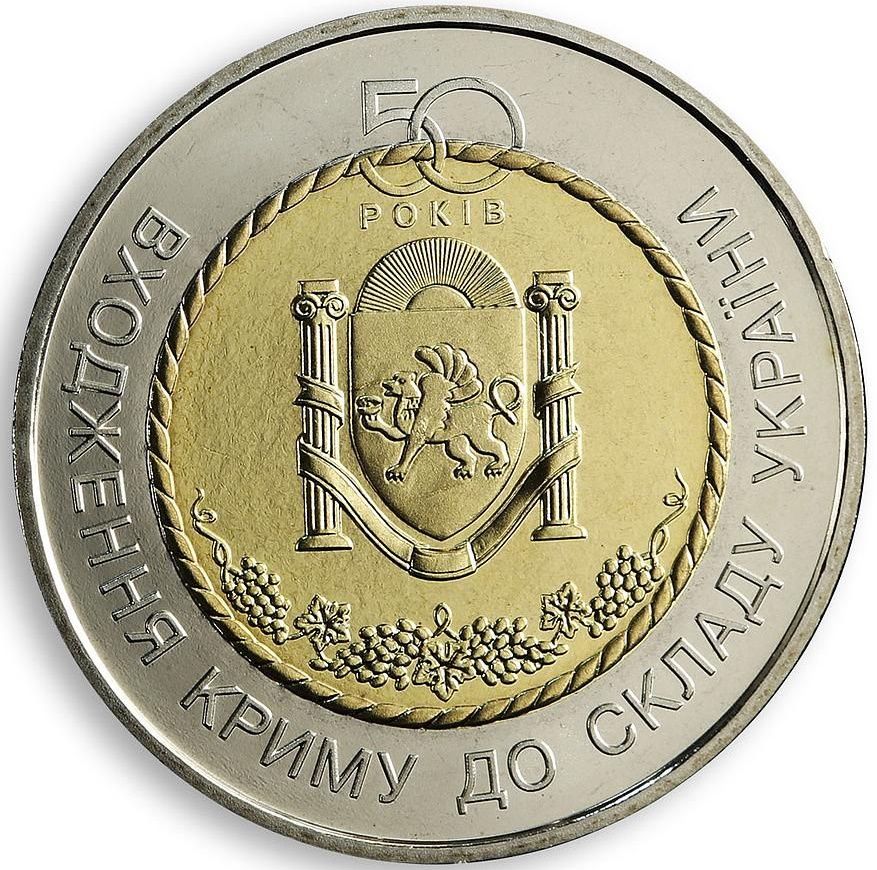 Опис: У центрі зображено герб Автономної Республіки Крим, під ним — гроно винограду; зовнішнє та вставне кільця з'єднані джутом, по зовнішньому кільцю йде круговий напис: ВХОДЖЕННЯ КРИМУ ДО СКЛАДУ УКРАЇНИ (Приєднання Криму до складу України), вище — напис — 50 РОКІВ (50 років)