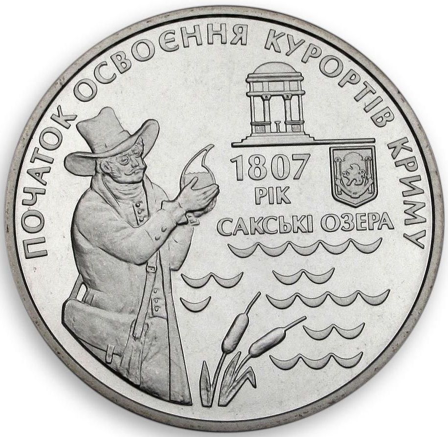 Опис: Зліва зображено хіміка Фелікса Де Серру (у 1807 році він вперше проаналізував сакські грязі) на тлі озера, праворуч вгорі — насосна кімната, знизу — напис — 1807 / РІК / САКСЬКІ ОЗЕРА (1807 / РІК / САКСЬКІ ОЗЕРА), а також герб Автономної Республіки Крим. Зверху – напівкругла легенда – ПОЧАТОК ОСВОЄННЯ КУРОРТІВ КРИМУ (Початок освоєння курортів Криму).