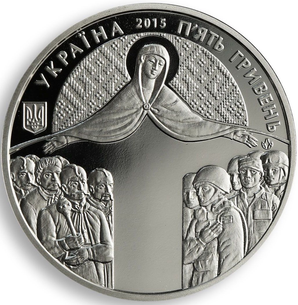 Опис: На тлі орнаменту зображено: фігуру Пресвятої Богородиці, під омофором якої зображені козаки (зліва) та сучасні воїни і захисники (праворуч); малий герб України (зліва); зверху — напівкруглі написи: УКРАЇНА, 2015, П'ЯТЬ ГРИВЕНЬ (Україна, 2015, п'ять гривень) — і знак Монетного двору Національного банку України (праворуч).