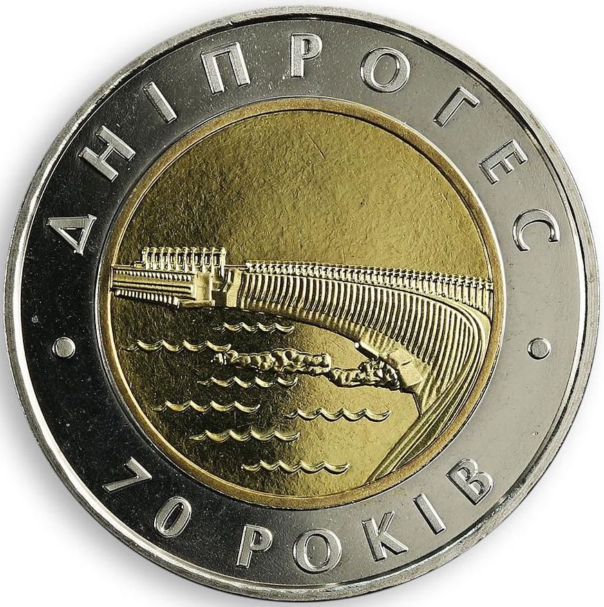 Опис: У внутрішньому кільці зображено: турбіну з аркою машинного відділення електростанції, малий герб України, рік випуску монети — 2002, логотип Монетного двору Національного банку України. У зовнішньому кільці розміщено кругові написи: УКРАЇНА, 5 ГРИВЕНЬ (Україна/ 5/ гривня).