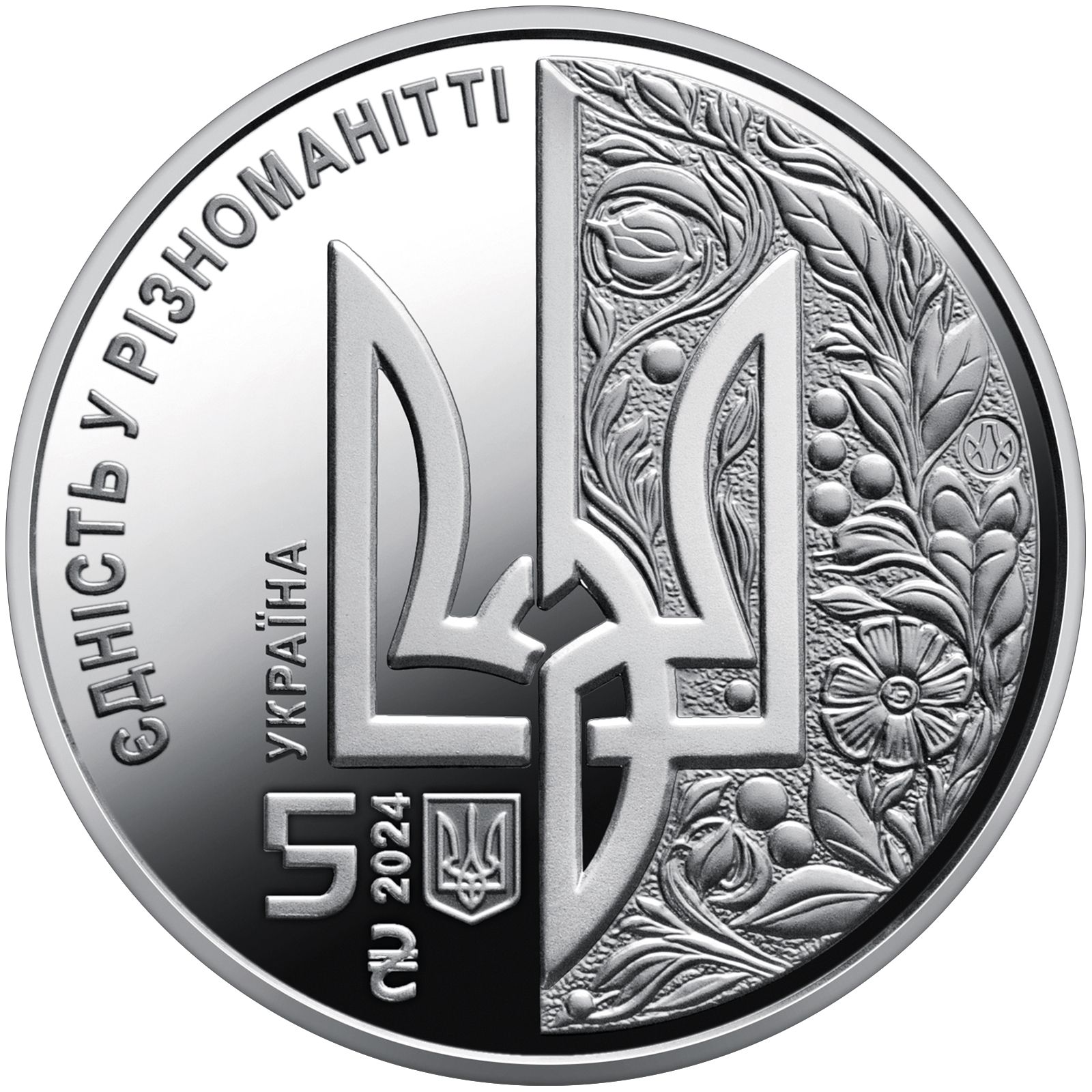 Опис: У центрі — стилізований тризуб, символ України. Ліворуч від тризуба — офіційний девіз ЄС. Нижче — номінал монети 5, графічний символ гривні, рік випуску монети — 2024 та малий герб України. Праворуч від тризуба — квітковий орнамент, що символізує процвітання країни та її самобутню культуру. Також є знак монетного двору НБУ «Банкнотно-монетний двір НБУ».