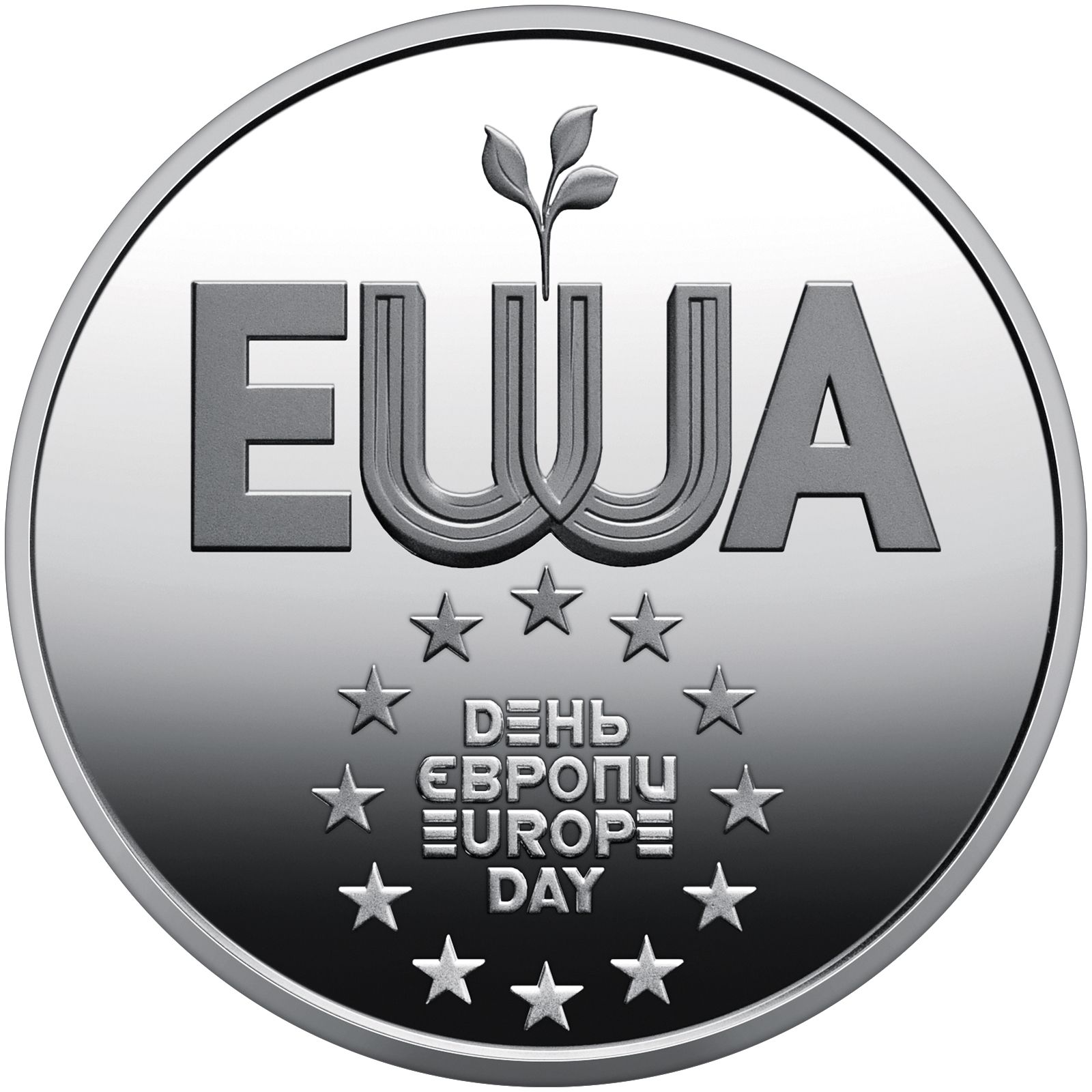 Опис: На гладкому тлі розміщені абревіатури EU та UA, які переплітаються, створюючи візуальний символ єдності України та Європи. Дві літери «U» здаються однією, утворюючи образ нового життя, яке проростає під егідою Європейського Союзу. Написи ДЕНЬ / ЄВРОПИ / EUROPE / DAY оточені 12 зірками, схожими на ті, що зображені на прапорі ЄС, які символізують єдність, цілісність і гармонію народів Європи.