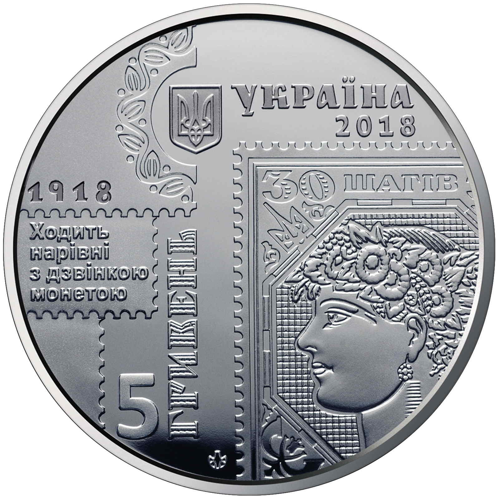 Опис: Малий герб України, праворуч від якого знаходиться напис УКРАЇНА (Україна)/2018; нижче — фрагменти поштової марки номіналом 30 шах; ліворуч — вертикально розташований номінал 5 ГРИВЕНЬ (п'ять гривень) та написи 1918, ХОДИТЬ/НАРІВНІ/З ДЗВІНКОЮ/МОНЕТОЮ (1918, має таку саму силу, як і металеві монети); нижче — знак монетного двору ДП «Банкнотно-монетний двір НБУ».