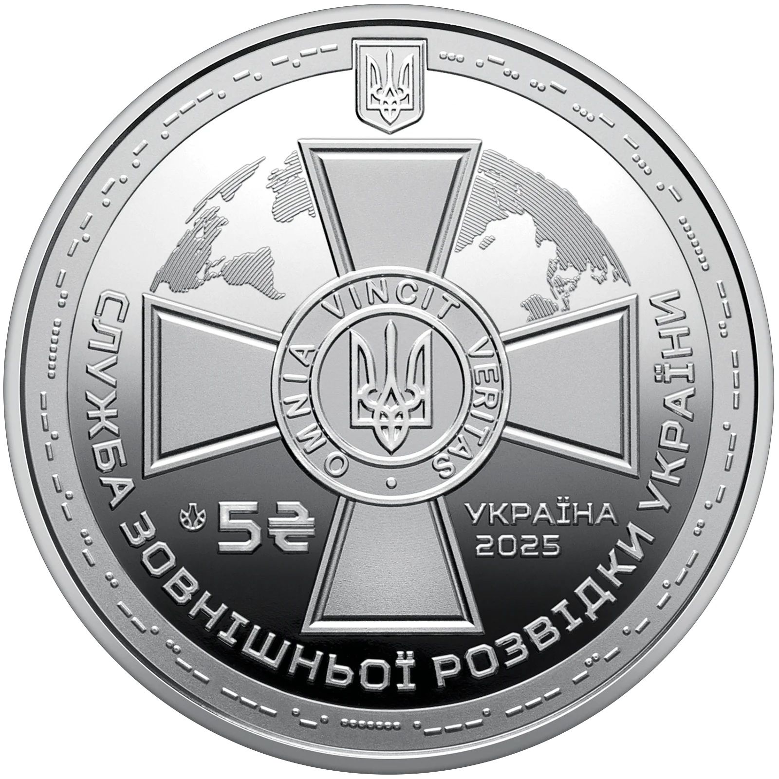 Опис: По периметру кола перші три слова назви відомства закодовані морзянкою, яка повторюється в нижній частині: СЛУЖБА ЗОВНІШНЬОЇ РОЗВІДКИ УКРАЇНИ УКРАЇНА. У центрі монети зображено хрест, який є основним елементом нових символів та відомчих заохочувальних нагород Служби зовнішньої розвідки України. У центрі хреста — знак князівської держави Володимира Великого (тризуб), обрамлений девізом служби латиною: OMNIA VINCIT VERITAS («Правда перемагає все»). Контури карти з континентами навколо центру символізують просторовий обсяг розвідувальної діяльності служби.