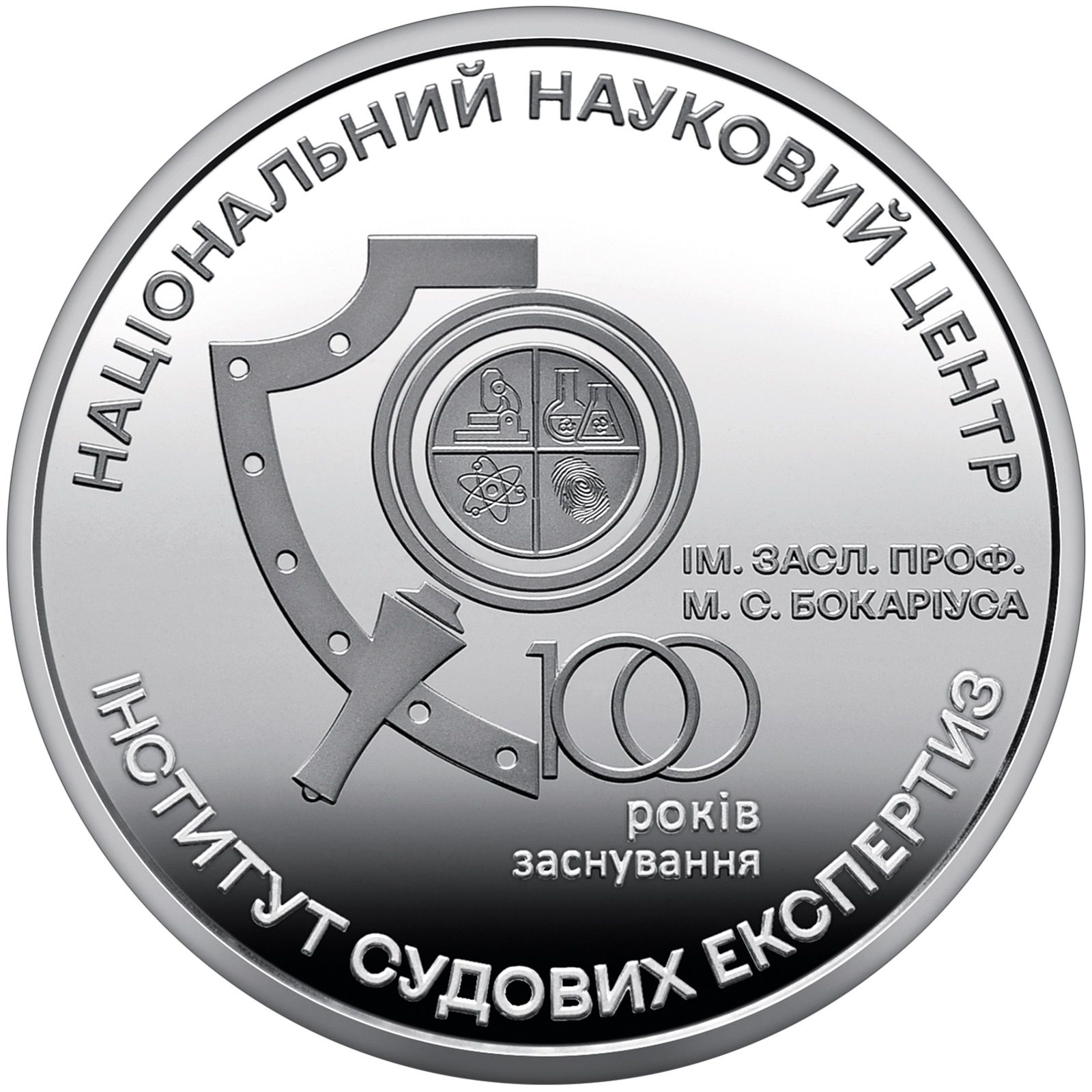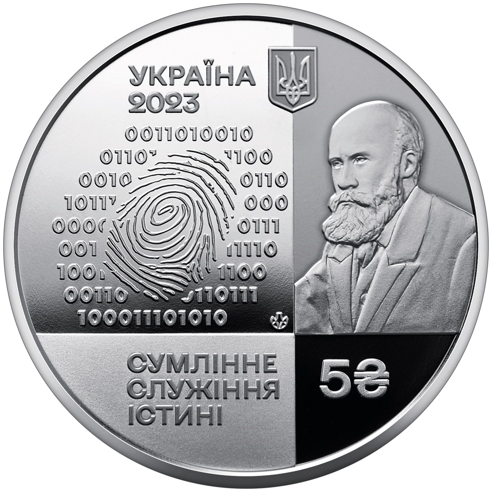 Опис: Зображення у вигляді відбитка пальця та бінарного коду навколо нього, що символізує цифрову обробку інформації та пошук даних під час криміналістичних досліджень, праворуч — портрет М. С. Бокаріуса, одного із засновників судової медицини та криміналістики в Україні.