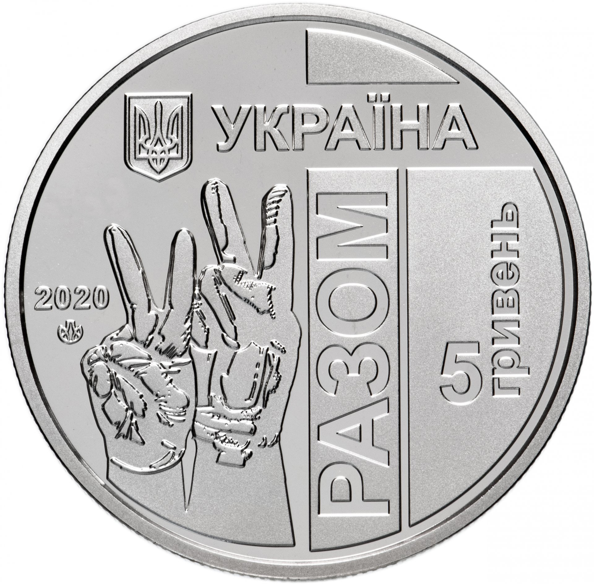 Опис: Зверху розміщено малий герб України та напис «УКРАЇНА»; праворуч, на матовому тлі, розміщено вертикальний напис «РАЗОМ» та номінал монети «5/ГРИВЕНЬ (5/гривень) (написана вертикально); ліворуч, на гладкому тлі, зображено дві руки, що показують знак V – поширений жест, який означає перемогу та мир, рік випуску монети 2020 та знак монетного двору ДЗПП НБУ.