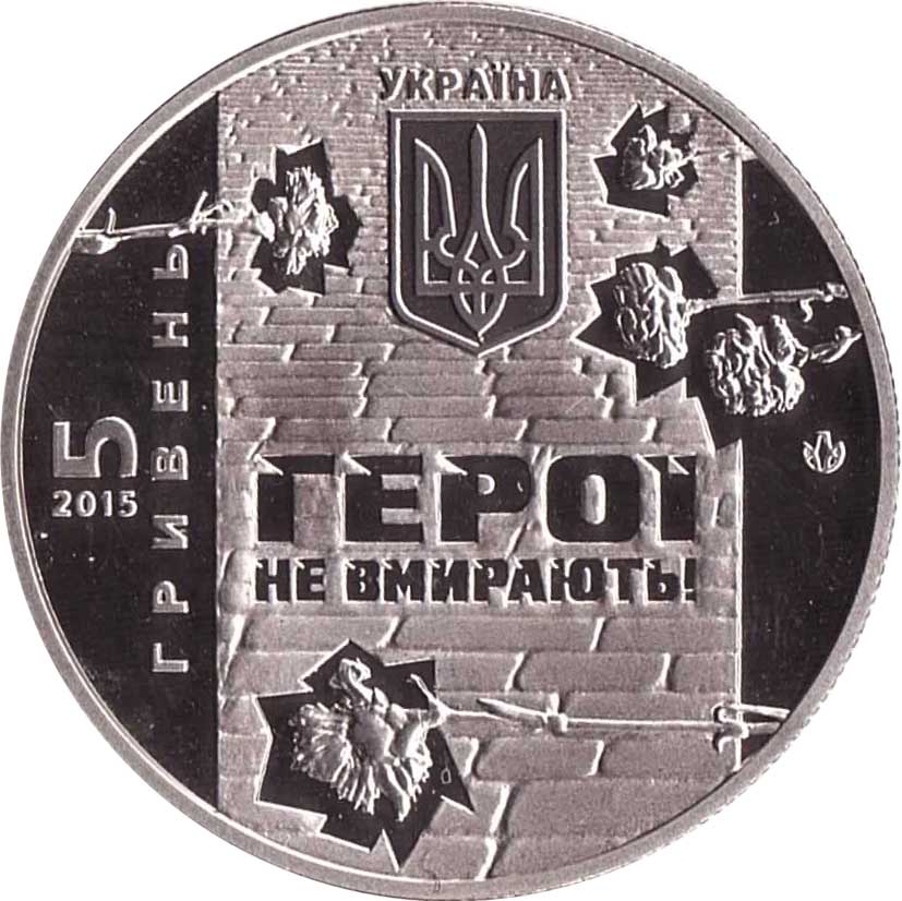 Опис: Зображено: зверху, на тлі бруківки, напис «Україна» з малим гербом України під ним; на бруківці викладені гвоздики, що символізують пролиту кров героїв, та напис «ГЕРОЇ/НЕ ВМИРАЮТЬ! (Герої / не вмирають!); на гладкому тлі ліворуч – номінал монети 5/ГРИВЕНЬ (5/гривень) та рік випуску 2015, праворуч – знак Монетного двору Національного банку України.